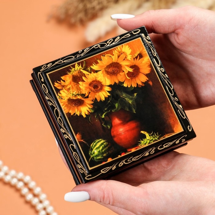 Шкатулка «Букет подсолнухов в вазе», 10×10 см, лаковая миниатюра