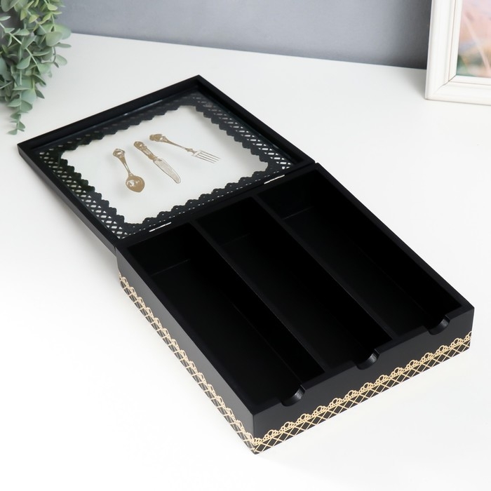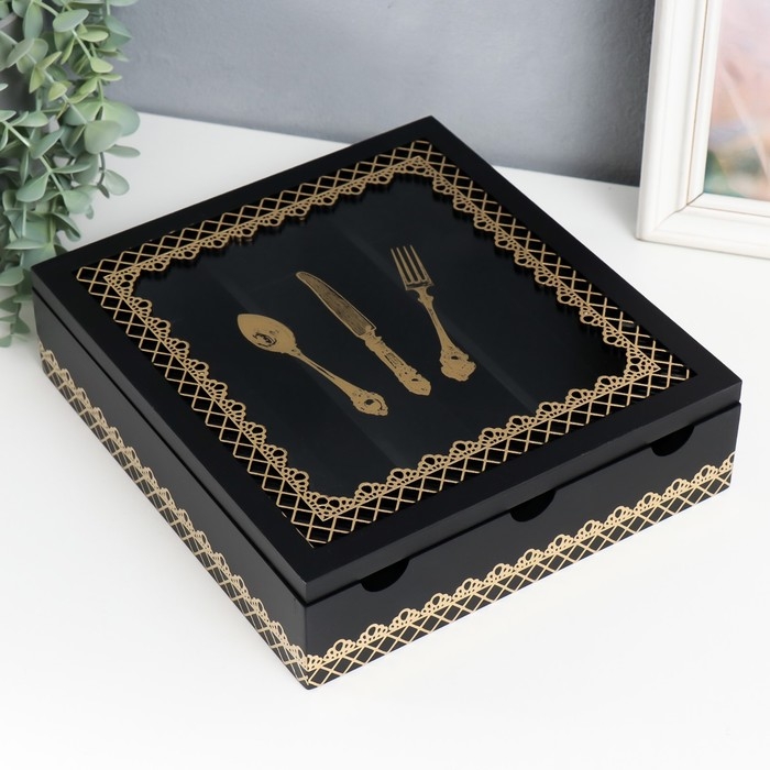 Шкатулка дерево с делениями "Столовые предметы" чёрная с золотом 26х24х6,8 см