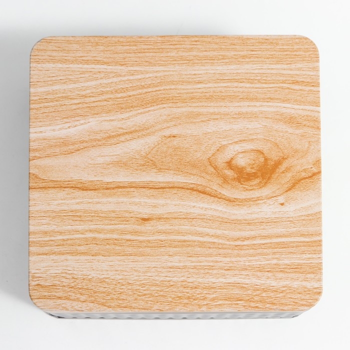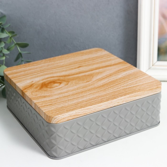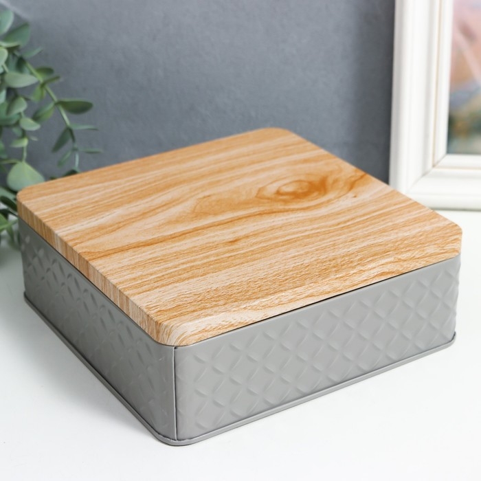 Шкатулка металл квадрат "Ромбы" серая, крышка под дерево 6х17х17 см