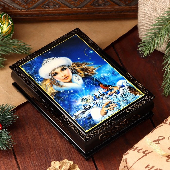 Шкатулка «Снегурочка со снегирём», 10×14 см, лаковая миниатюра