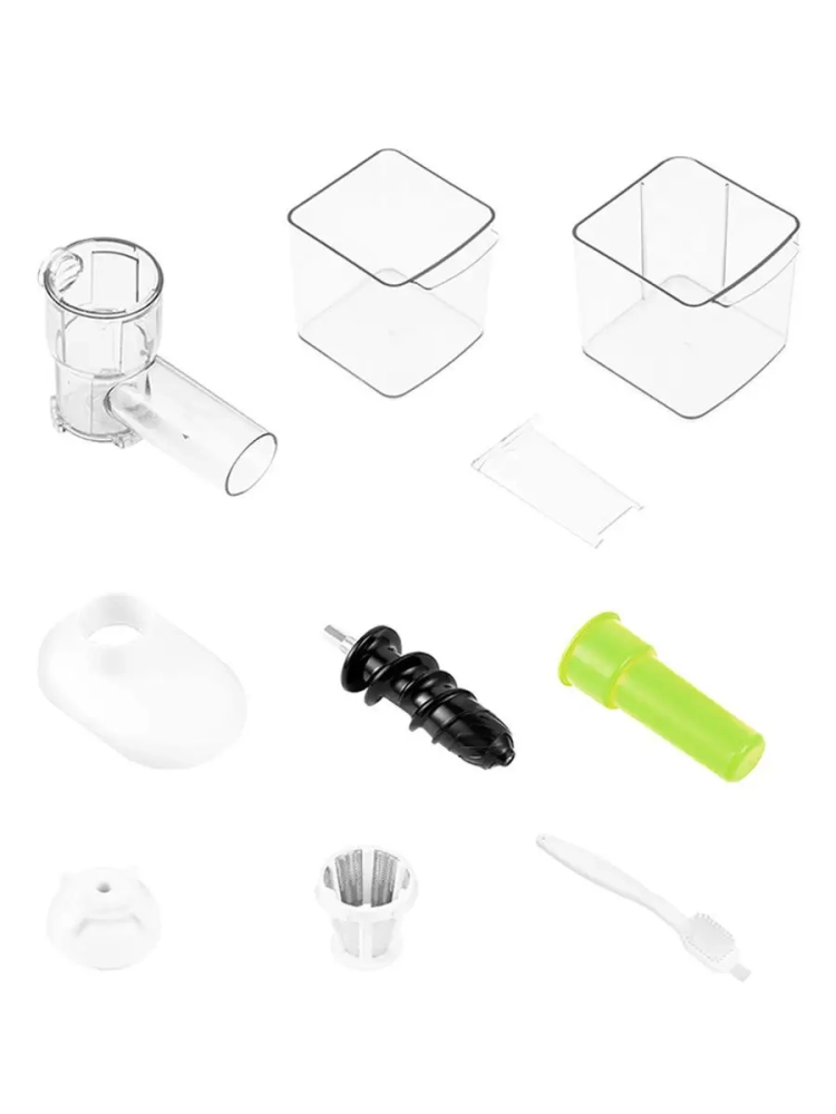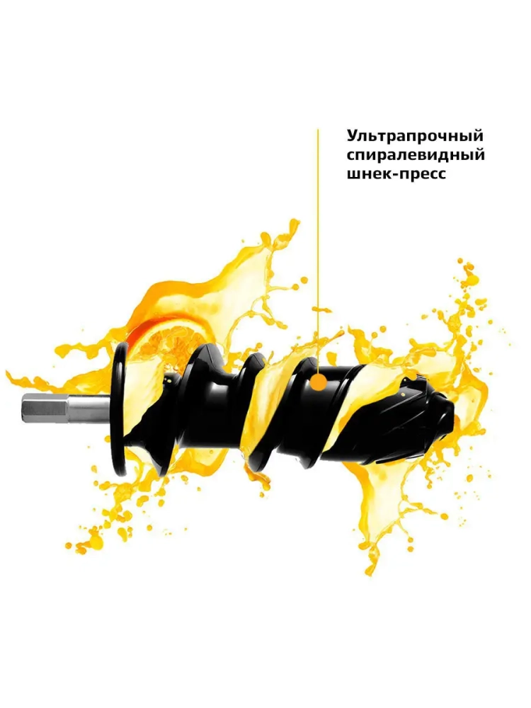 В отличие от обычной центробежной высокоскоростной соковыжималки, работающей при 1000-24000 об/мин и потребляющей до 1500 Вт электроэнергии, шнековая соковыжималка работает на низких скоростях вращения, около 60-80 об/мин, и потребляет всего 150 Вт. Однако, несмотря на малую скорость вращения, шнековая соковыжималка отжимает сок так же быстро, как и традиционная центробежная. Спиралевидный шнек-пресс из ультрапрочного материала дробит и прессует продукт, а затем продавливает мякоть через фильтр, отделяя жмых от сока. Эта технология позволяет сохранить гораздо больше питательных веществ, содержащихся в овощах и фруктах, и получить сок с высоким содержанием клетчатки и растительных ферментов, являющихся природными антиоксидантами.