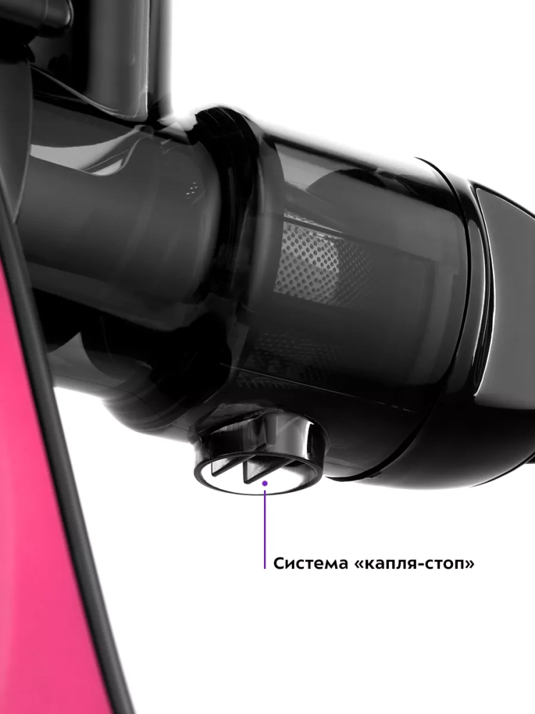Шнековая соковыжималка работает на низких скоростях вращения. Низкая скорость вращения обеспечивает более низкую температуру в процессе отжима в отличие от центробежной соковыжималки, что способствует сохранению питательной ценности продуктов. В шнековой соковыжималке сок почти не вспенивается, а время его контакта с воздухом минимально, поэтому сок не окисляется кислородом.