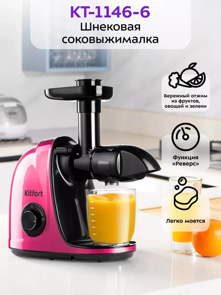 Шнековая соковыжималка Kitfort KT-1146 позволяет отжимать максимально возможное количество сока из фруктов, большинства овощей и зелени с сохранением всех их полезных компонентов: витаминов, аминокислот и минералов. Соковыжималка легко собирается и просто моется после работы.