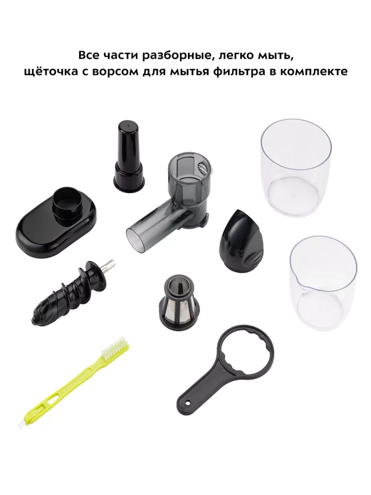 Фильтр сделан из нержавеющей стали с пластмассовым креплением, что делает его прочным и не подверженным коррозии. Для мытья фильтра в комплекте к соковыжималке прилагается щетка с жестким ворсом, помогающая вычистить остатки мякоти.