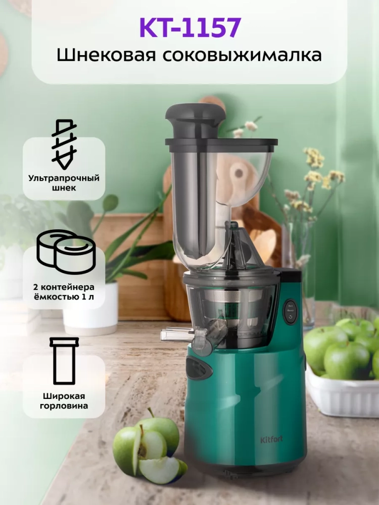 Шнековая соковыжималка Kitfort KT-1157 позволяет отжимать максимально возможное количество сока из фруктов, большинства овощей и зелени с сохранением всех их полезных компонентов: витаминов, аминокислот и минералов. Соковыжималка быстро собирается и легко моется после работы.