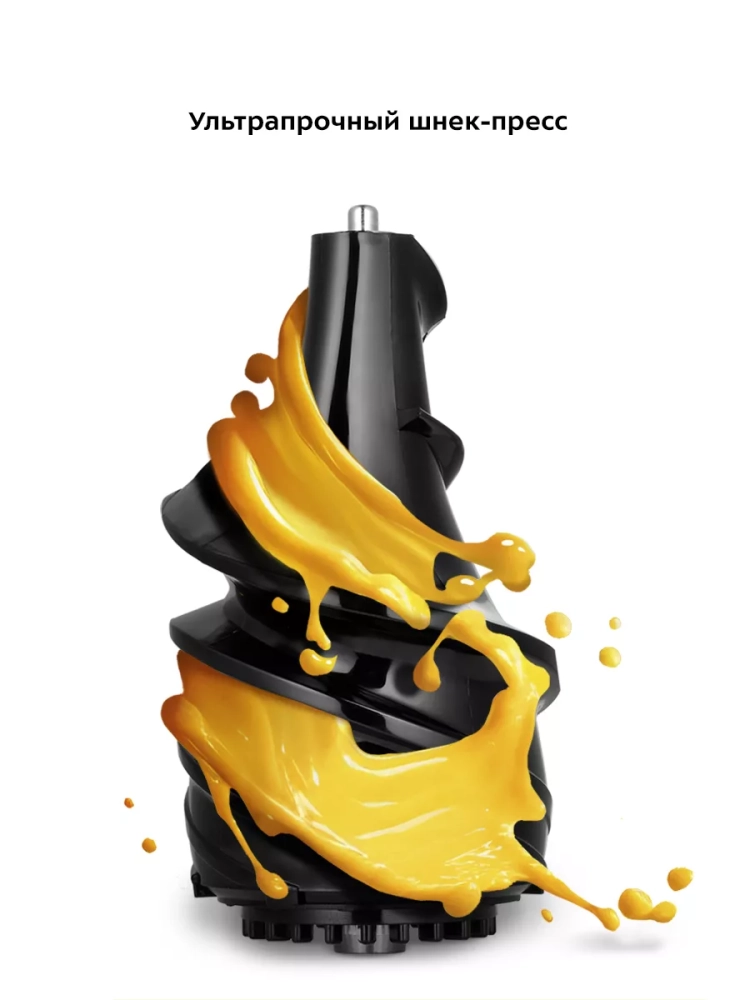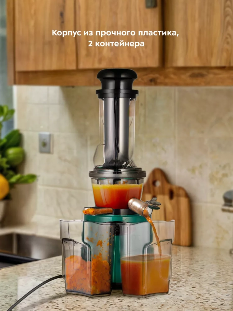 В комплекте предусмотрены толкатель для безопасного проталкивания продуктов, прозрачный контейнер для жмыха (1 л) и такой же контейнер для сока.