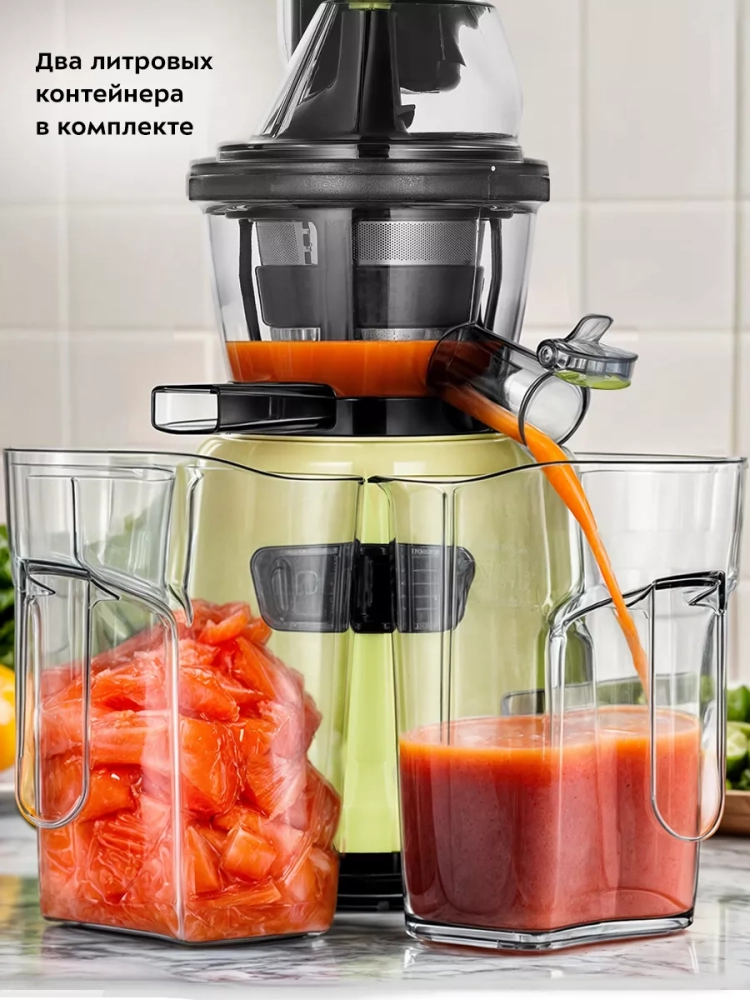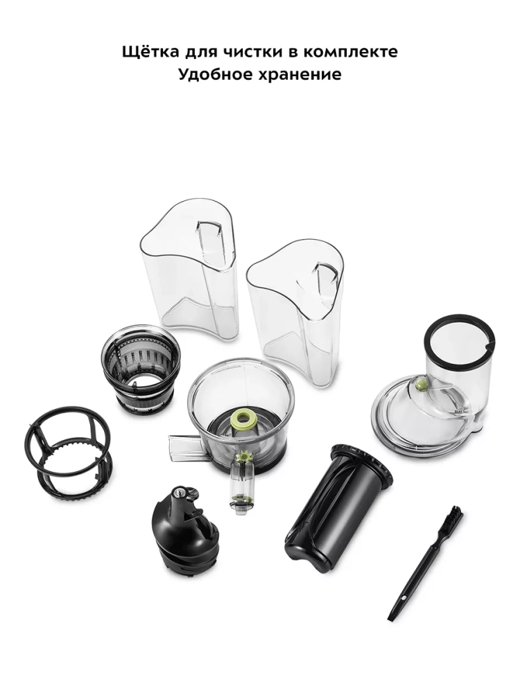 В комплекте предусмотрены толкатель для безопасного проталкивания продуктов, прозрачный контейнер для жмыха (1 л) и такой же контейнер для сока. Широкая загрузочная горловина позволяет загружать продукты, не нарезая их слишком мелко, что ускоряет процесс приготовления сока.