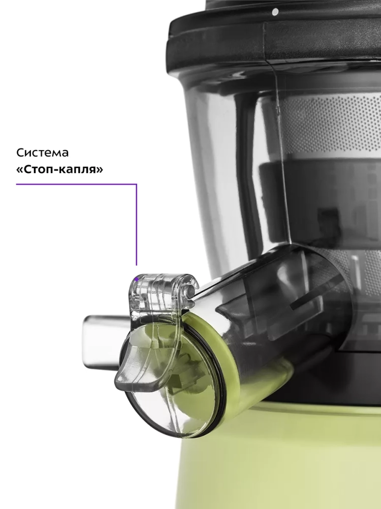В соковыжималке КТ-1159 предусмотрена система «Стоп-капля». Это удобно, практично и к тому же позволяет сохранить поверхность вокруг соковыжималки чистой.