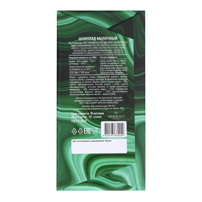 Погрузитесь в новогоднюю атмосферу с молочным шоколадом "Символ Нового Года - Змея" оформленным на праздничном зелёном фоне! Этот шоколад – не просто угощение, а настоящая находка для тех, кто хочет добавить волшебства в свои праздники. Каждый кусочек молочного шоколада радует своим нежным вкусом, тая во рту и наполняя ваше сердце теплом. Специальная упаковка с ярким изображением символа 2025 года — змеей, выполненная на зеленом фоне, создает ощущение праздника, идеально вписываясь в атмосферу новогоднего торжества.