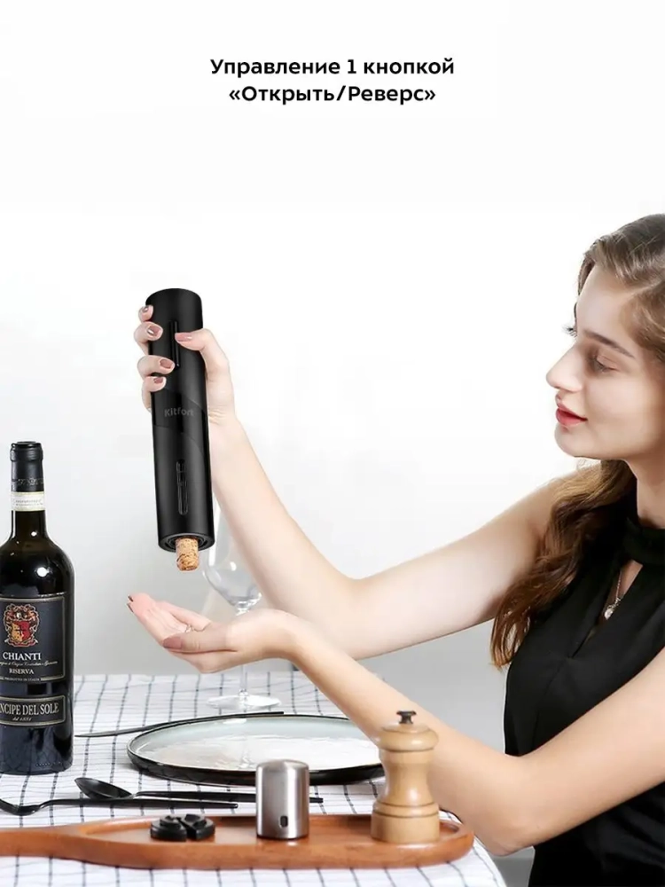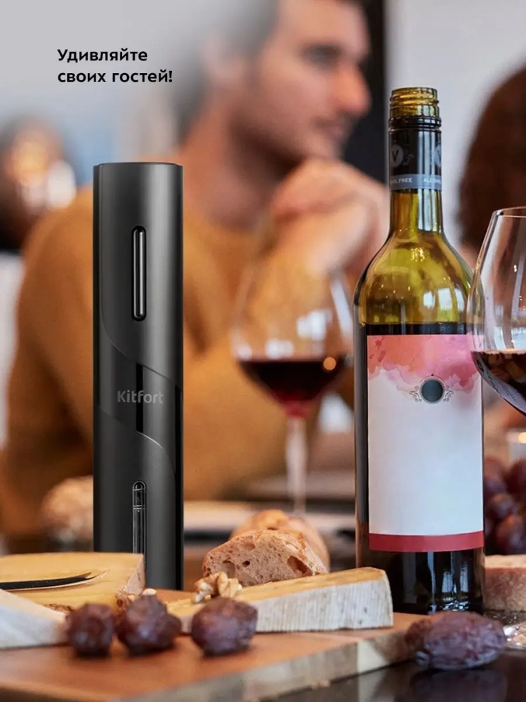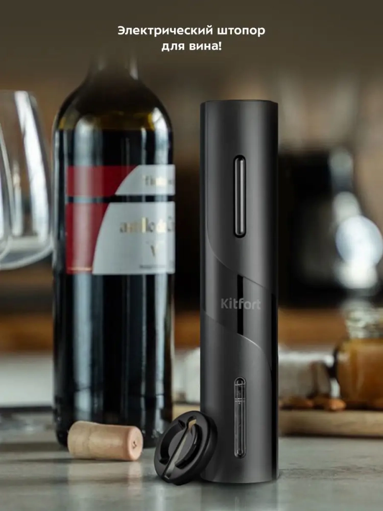 Электрический штопор Kitfort KT-4036 поможет легко, быстро и безопасно открыть бутылку вина. Процесс открывания бутылки станет простым и займет всего несколько секунд. Также вам больше не придется прикладывать дополнительные усилия, как это часто бывает при использовании обычного штопора. Электрический штопор предотвращает риск пролить вино или пораниться. С электрическим штопором вы можете эффектно открыть вино для подачи к столу и удивить гостей. Корпус устройства выполнен из пластика, а спираль полностью скрыта корпусом. Чтобы наблюдать за процессом, в корпусе есть прозрачная вставка. В комплекте есть специальный нож для фольги, который крепится к нижней части штопора для хранения. Пользоваться электрическим штопором очень просто, так как у него всего одна кнопка: при нажатии на нижнюю часть кнопки штопор открывает пробку, а при нажатии на верхнюю часть включается движение в обратном направлении, чтобы удалить пробку из штопора. Устройство питается от 4 батареек типа АА (в комплект не входят), что позволяет сразу после установки батареек пользоваться штопором, не дожидаясь зарядки аккумулятора. Чтобы легко вытащить старые батарейки для замены, в отсеке для батареек предусмотрена небольшая лента. Благодаря строгому, минималистичному дизайну и небольшим размерам электрический штопор легко впишется в ваш интерьер.