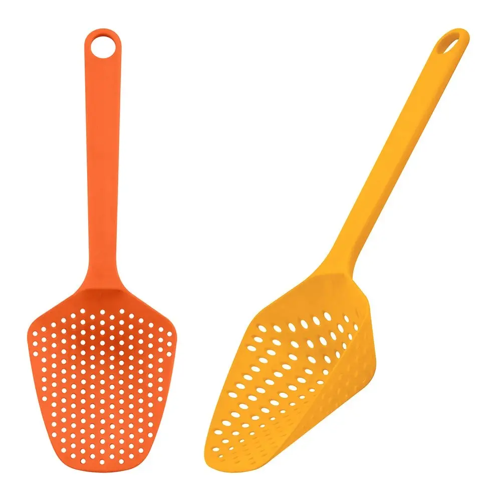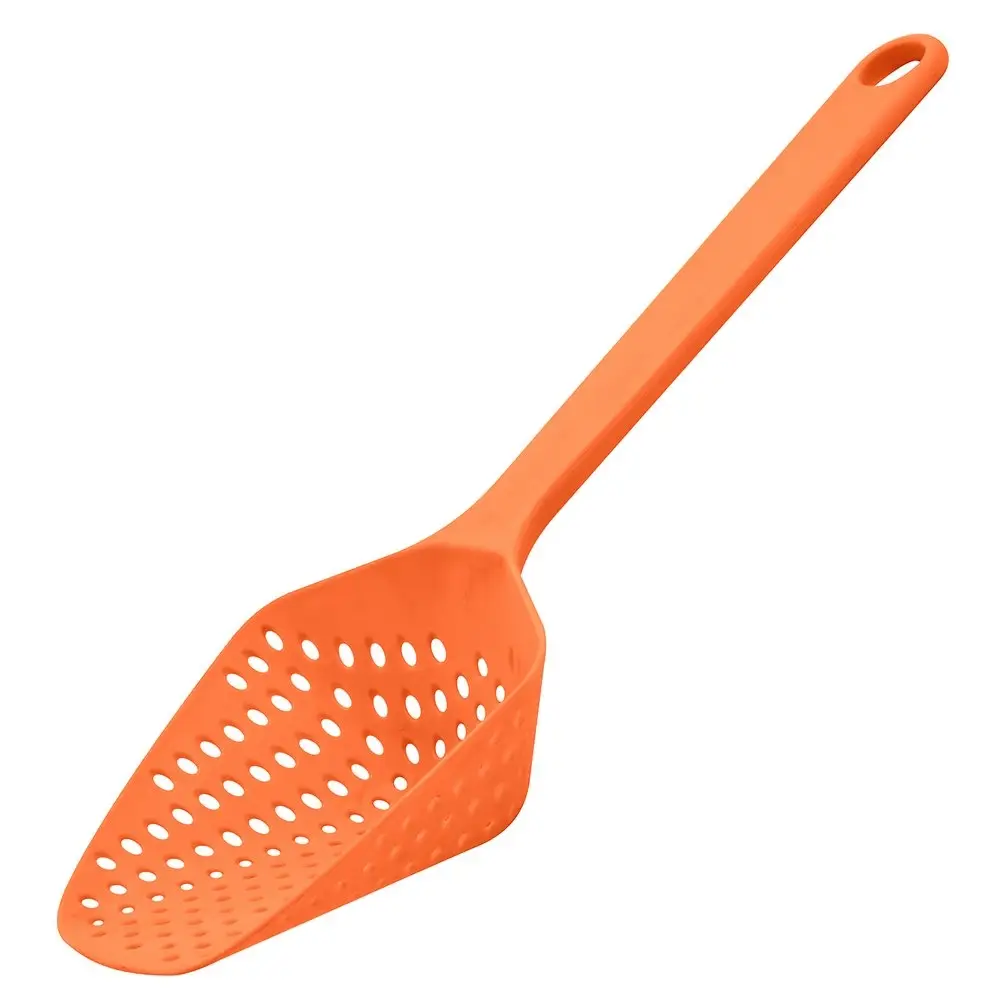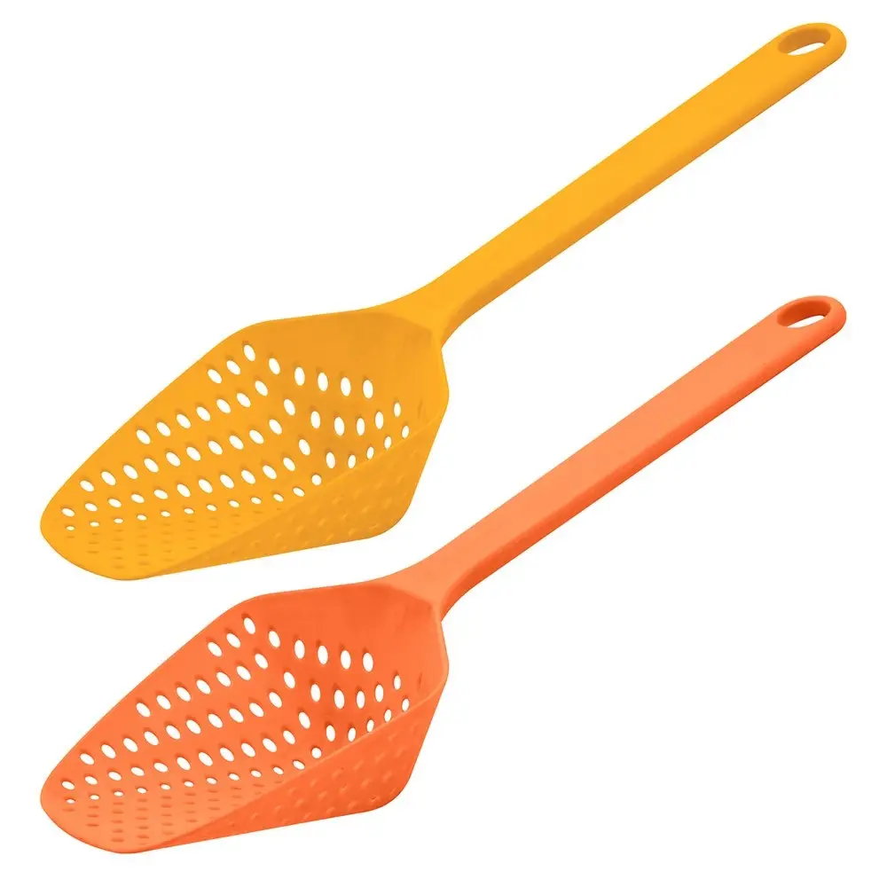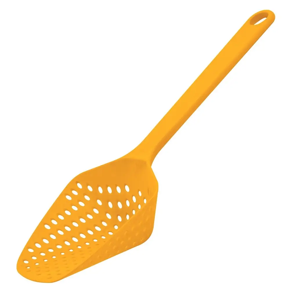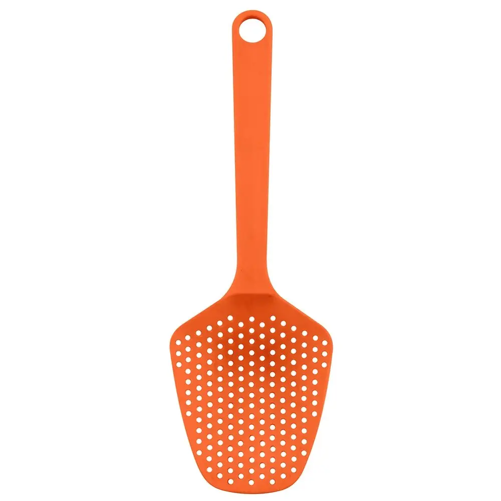 Приспособления 2-в-1 — это всегда выигрышно для любой кухни. Шумовка-дуршлаг решает одновременно 2 задачи: поможет вам снять пенку, выловить продукты и слить воду с макарон, пельменей и других блюд. Удобство еще и в том, что вы сразу зачерпываете большую порцию, которую сливаете и кладете на тарелку. Изделие имеет особую конструкцию, благодаря которой вода очень быстро уходит через отверстия. После использования мойте с моющими средствами или в посудомоечной машине. Изделие изготовлено из пластмассы (нейлон), не портится под воздействием высоких температур. На ручке есть отверстие для удобства хранения на крючке.