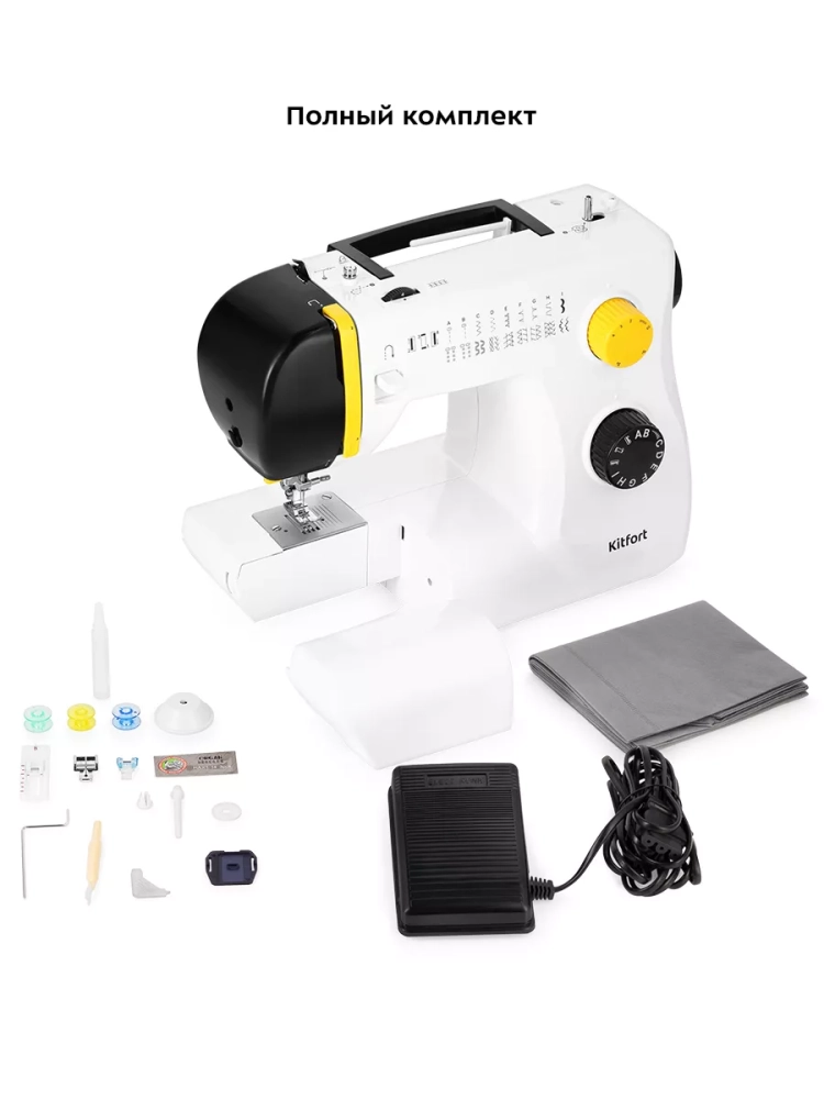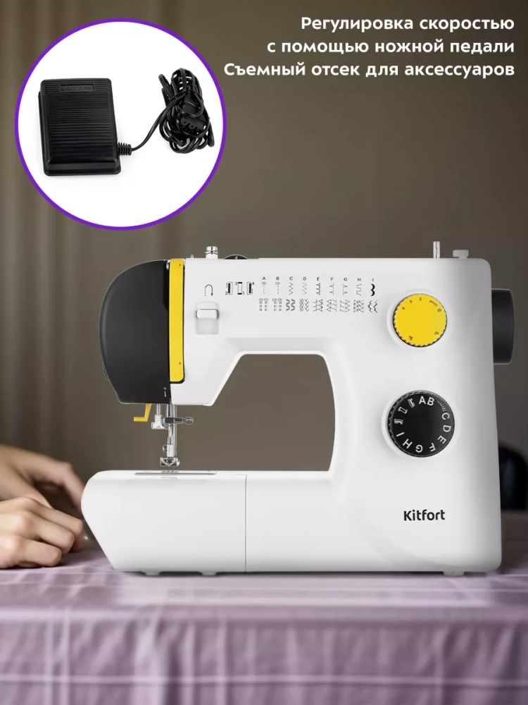 Швейная машина Kitfort КТ-6057 оснащена съемным отсеком для аксессуаров и рукавной платформой, на которой удобно обрабатывать узкие детали одежды, например, манжеты рукавов. В отсеке для аксессуаров удобно хранить дополнительные лапки, иглы и другие мелкие принадлежности.