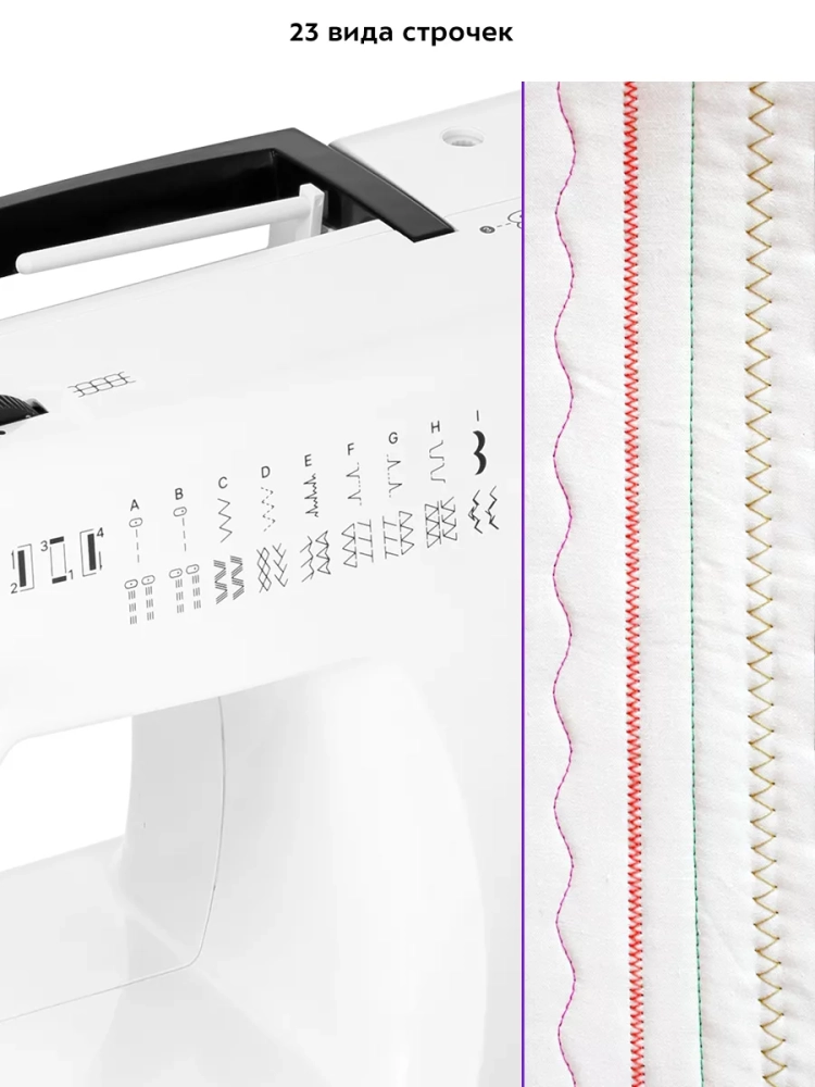 Данная швейная машина отличается простым, интуитивно понятным управлением, позволяющим работать с ней как опытным швеям, так и новичкам в шитье. Технические характеристики модели позволяют выполнять все стандартные швейные операции: прибор может выполнять 23 вида строчек, включая строчки для обработки петель для пуговиц, а также эластичные трикотажные строчки. Также у устройства есть реверсный ход при шитье. Благодаря подсветке рабочей поверхности глаза меньше устают во время работы.