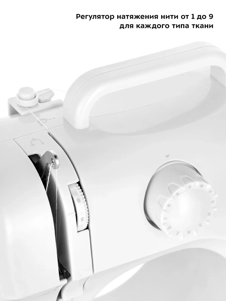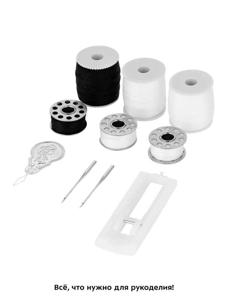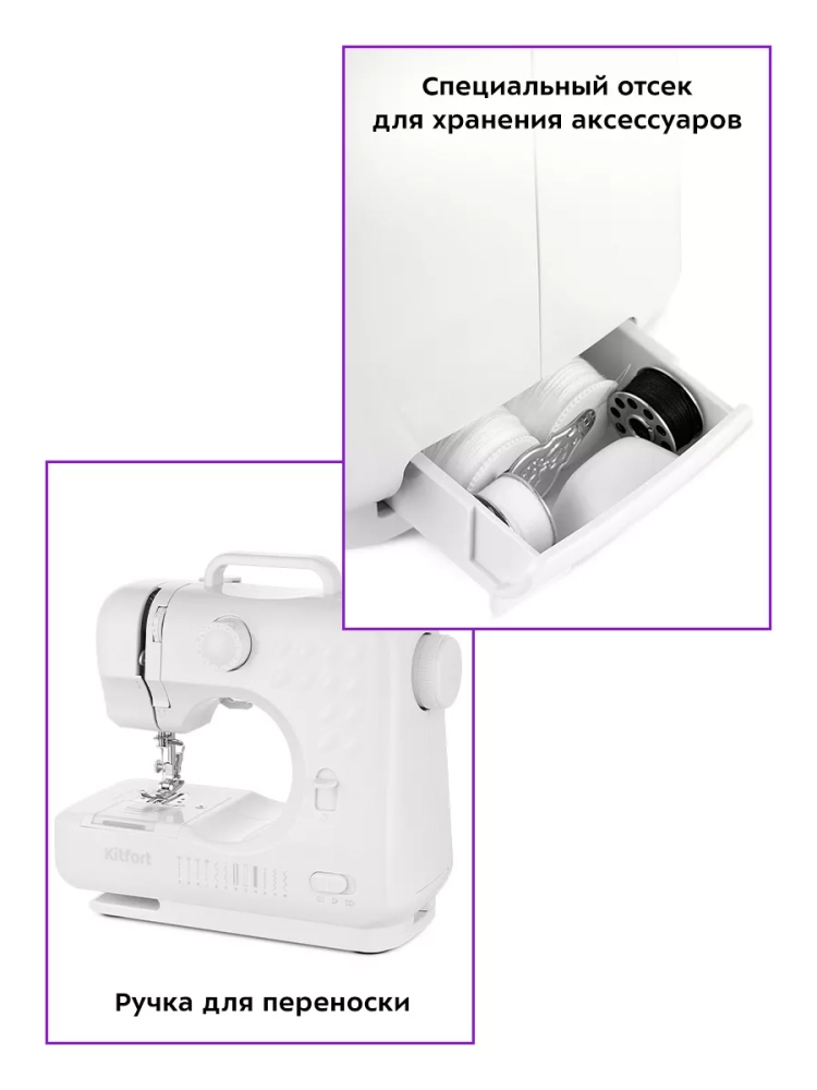 Швейная машина Китфорт КТ-6041 оснащена рукавной платформой, на которой удобно обрабатывать узкие детали одежды, например, манжеты рукавов. В выдвижном отсеке для аксессуаров удобно хранить дополнительные лапки, иглы и другие мелкие принадлежности. Также на корпусе устройства есть небольшая ручка для переноски.