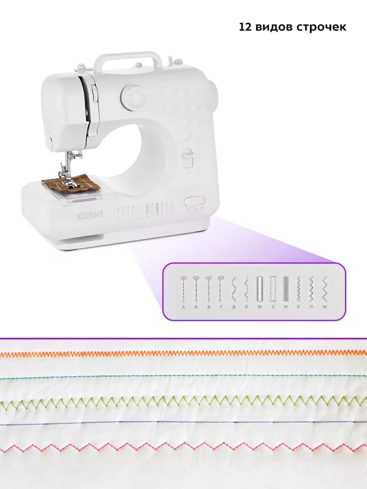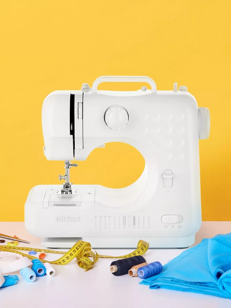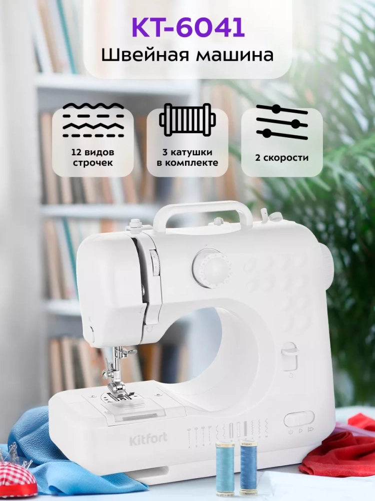 Kitfort КТ-6041 — это компактная электромеханическая швейная машина, у которой есть оптимальный набор функций для пошива и ремонта одежды и изделий из текстиля. Швейная машина небольшая и легкая, ее вес всего 1,8 кг, она не займет много места при транспортировке и хранении. Также КТ-6041 может работать от 4 батареек типа АА, благодаря чему ее при необходимости можно взять с собой.