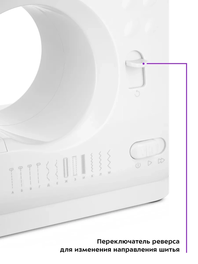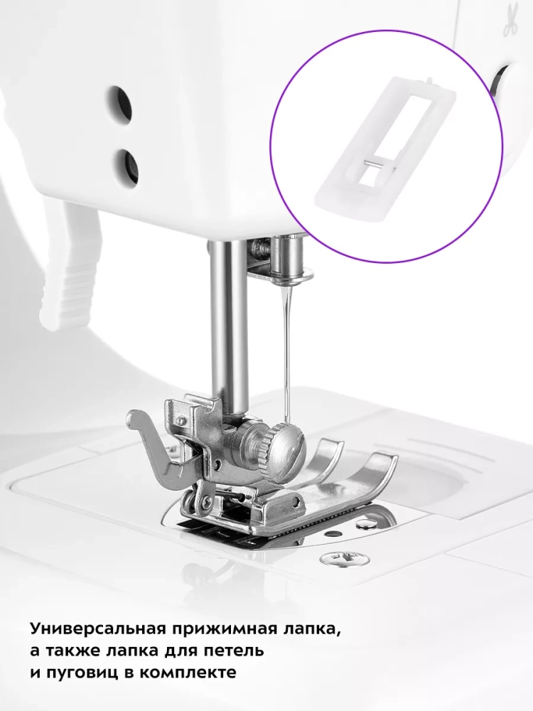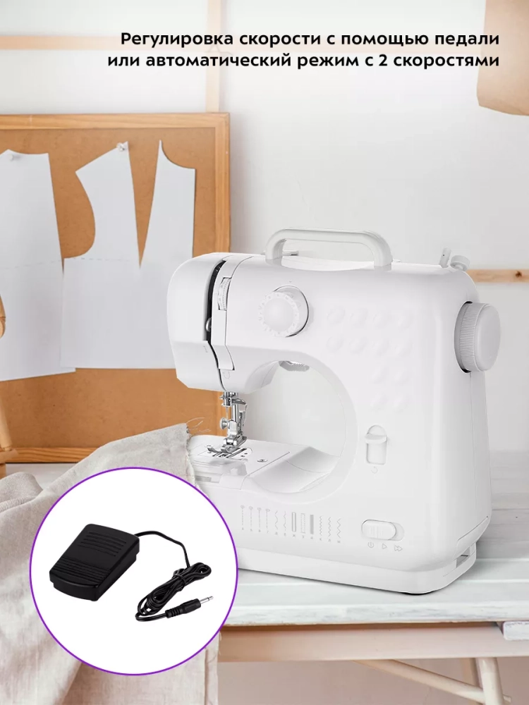 Скорость работы прибора можно регулировать с помощью ножной педали или установить автоматический режим и выбрать медленную или быструю скорость шитья.