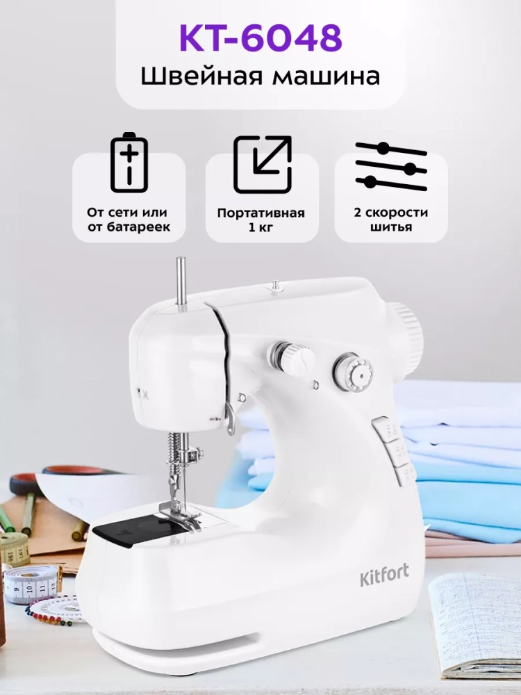 КТ-6048 — портативная швейная машина, предназначенная для быстрого ремонта одежды и изделий из текстиля. Портативная швейная машина очень компактная и легкая, ее вес всего 1 кг, она не займет много места у вас в доме, при транспортировке или хранении. КТ-6048 может работать от 4 батареек типа АА, благодаря чему ее при необходимости можно взять с собой.