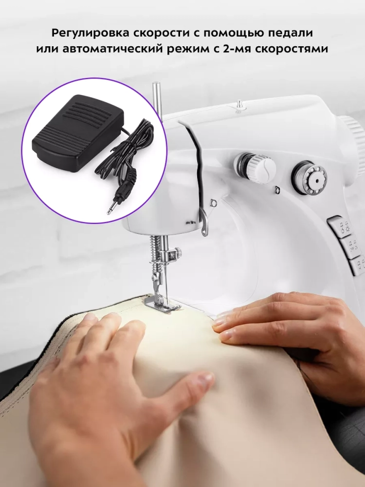 Скорость работы прибора можно регулировать с помощью ножной педали или установить автоматический режим и выбрать медленную или быструю скорость шитья.