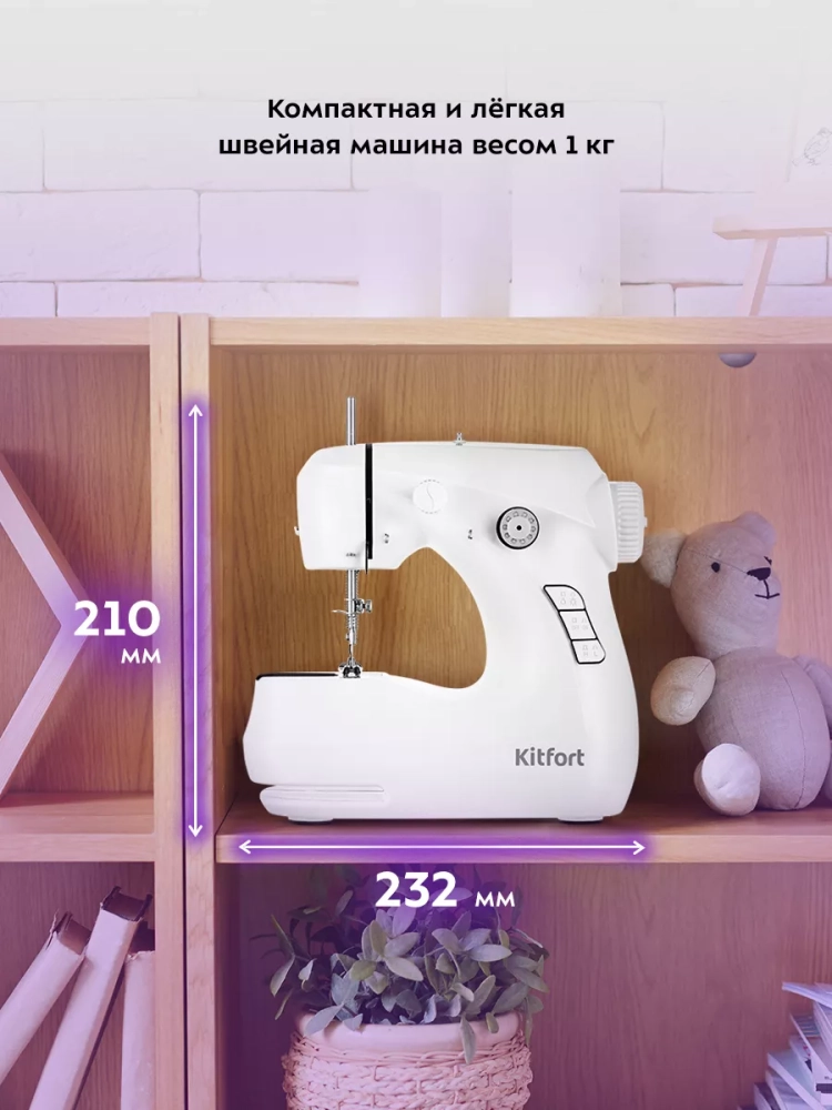 Данная швейная машина отличается простым, интуитивно понятным управлением, позволяющим работать на ней новичкам в шитье. Она прокладывает только прямую строчку, но благодаря регулировке натяжения нити подходит для работы с разными типами тканей. Также у устройства есть возможность шить в автоматическом режиме без использования ножной педали. Благодаря подсветке рабочей поверхности глаза меньше устают во время работы.