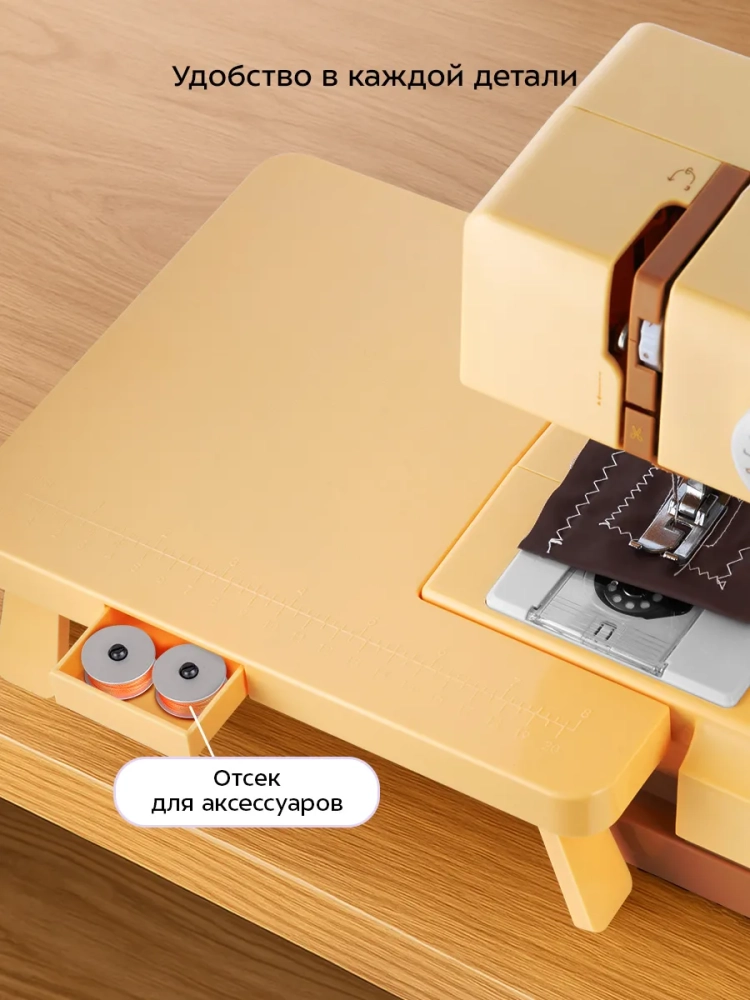 Швейная машина КТ-9930 оснащена рукавной платформой для обработки узких деталей одежды, например, манжет рукавов. В комплекте также идет приставной столик для увеличения рабочей поверхности. В столике есть отсек для аксессуаров, в котором можно хранить дополнительные лапки, иглы и другие мелкие принадлежности. Для удобства на столик нанесена линейка.