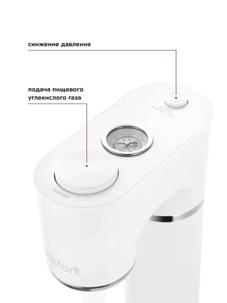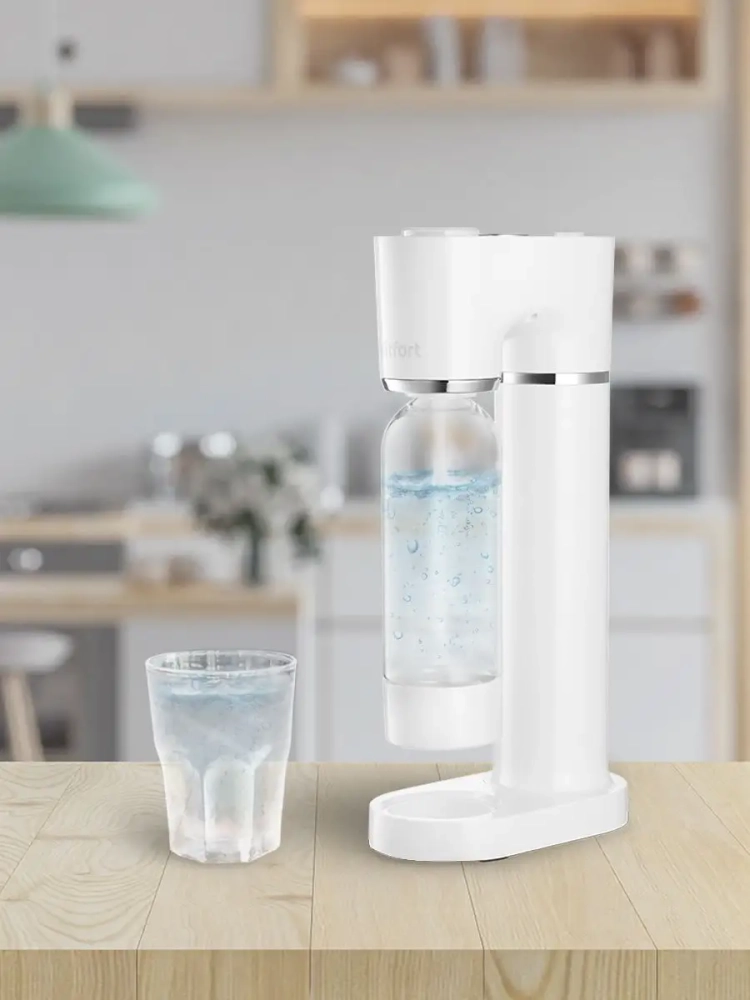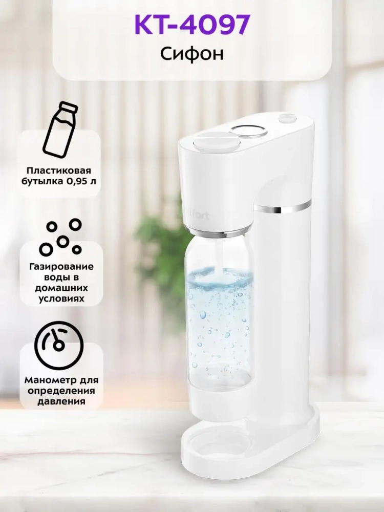 Сифон Kitfort KT-4097 — устройство для газирования воды, незаменимое для приготовления шипучих напитков и дома, и на природе. Достаточно иметь сам сифон и доступ к питьевой воде, желательно с возможностью охладить ее, чтобы в любой момент сделать газированный, освежающий напиток. Сифон работает без использования электричества, а также без батареек или аккумулятора.