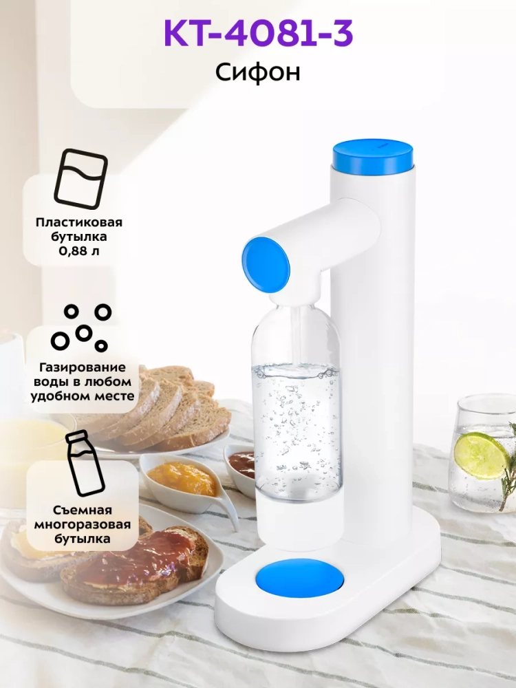 Сифон Kitfort KT-4081 предназначен для газирования воды, является незаменимым для приготовления шипучих напитков в домашних/офисных условиях. Свой потенциал он раскрывает и в загородных поездках, ведь вовсе необязательно тащить с собой множество бутылок — достаточно иметь лишь сам сифон и доступ к питьевой воде, желательно с возможностью охладить ее, чтобы в любой момент была возможность сделать газированный, освежающий напиток.