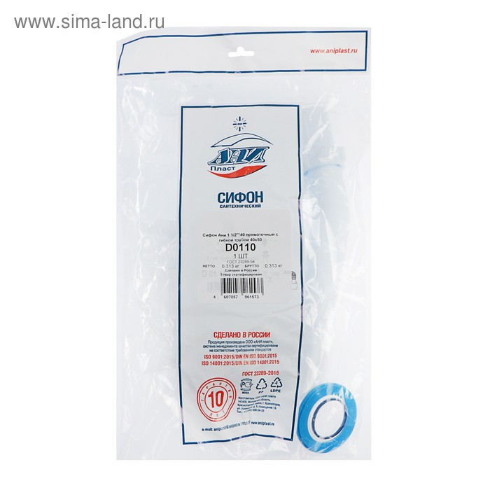 Сифон для мойки "АНИ Пласт" D0110, 1 1/2"х40 мм, прямоточный, с гофрой 40x50 мм