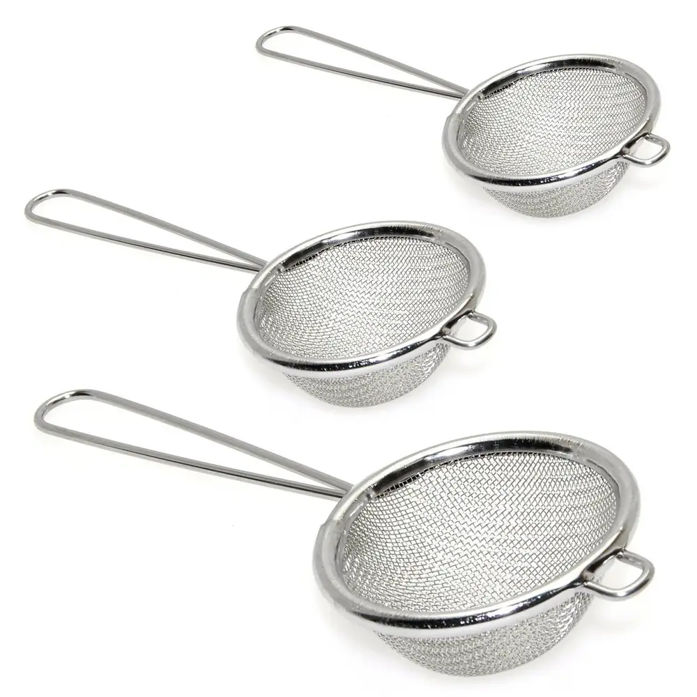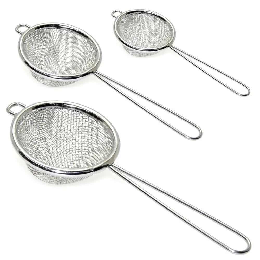 На кухне постоянно приходится что-то процеживать, ополаскивать, для этого очень удобно пользоваться ситом, а еще лучше – набором из трех сит. Ситечки разного диаметра подойдут для разной посуды, через одни удобно процеживать чай в кружку, в других промывать сухофрукты. Сита сделаны из стальной сетки с хромированным покрытием, оснащены удобной ручкой, за которую можно подвесить изделие на крючок. Размеры: диаметр 7,8 и 9 см.