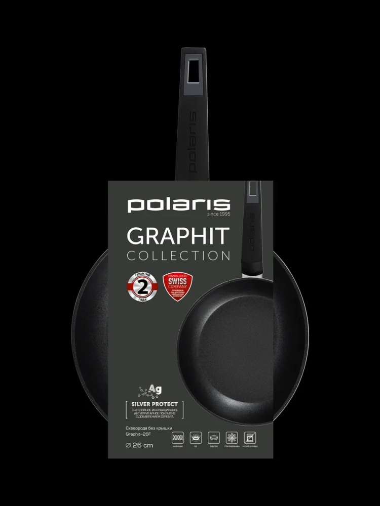 Polaris Graphit-26F - это универсальная сковорода, которая создана в соответствии с последними тенденциями и требованиями к профессиональной современной посуде: полностью безопасна для использования; не содержит вредных для здоровья веществ, таких как PFOA и PFOS; обладает антибактериальными свойствами; соответствует европейским стандартам качества.
