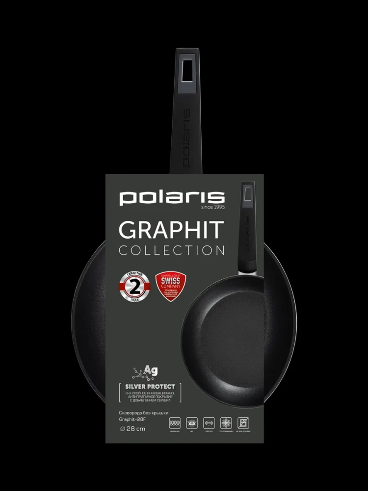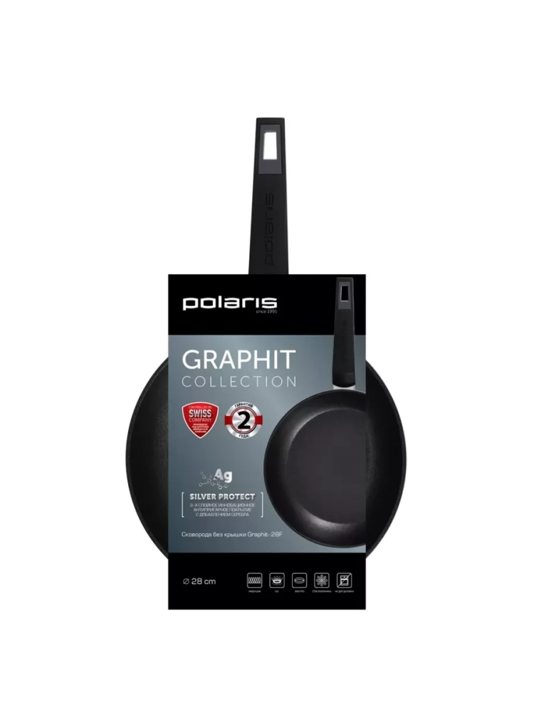 Polaris Graphit-28F - это универсальная сковорода, которая создана в соответствии с последними тенденциями и требованиями к профессиональной современной посуде: полностью безопасна для использования; не содержит вредных для здоровья веществ, таких как PFOA и PFOS; обладает антибактериальными свойствами; соответствует европейским стандартам качества.