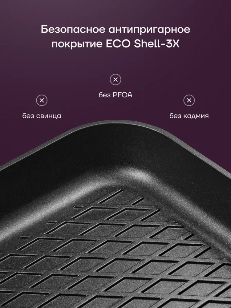 Изделие выполнено из литого алюминия с 3-х слойным антипригарным покрытием ECO SHELL-3X, которое обеспечивает равномерное распределение тепла, высокую прочность посуды. Алюминиевая сковорода устойчива к царапинам и механическим повреждениям, что позволит ей прослужить не один год, сохранив свой первозданный внешний вид.