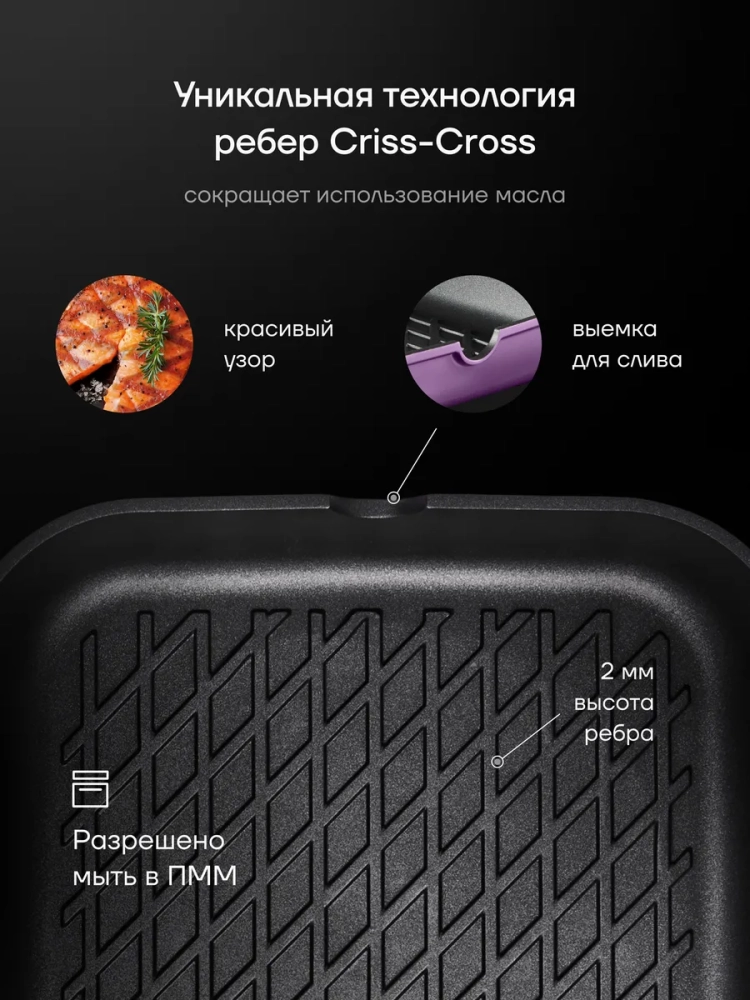 Благодаря уникальной технологии ребер на поверхности квадратной сковородки, вы сможете без труда приготовить стейки из рыбы и мяса, овощи, грибы или сочного цыпленка табака с неповторимой ароматной корочкой. ECO collection-28G идеально подходит для жарки и запекания без добавления масла. Посуда будет очень полезна для людей, которые предпочитают здоровое и правильное питание, ведь блюда, приготовленные на гриле, имеют меньше калорий. С помощью удобного носика на корпусе грильницы вы сможете без труда слить лишнюю жидкость во время приготовления пищи. Это уникальное дополнение сделает процесс приготовления еды еще более простым и приятным.