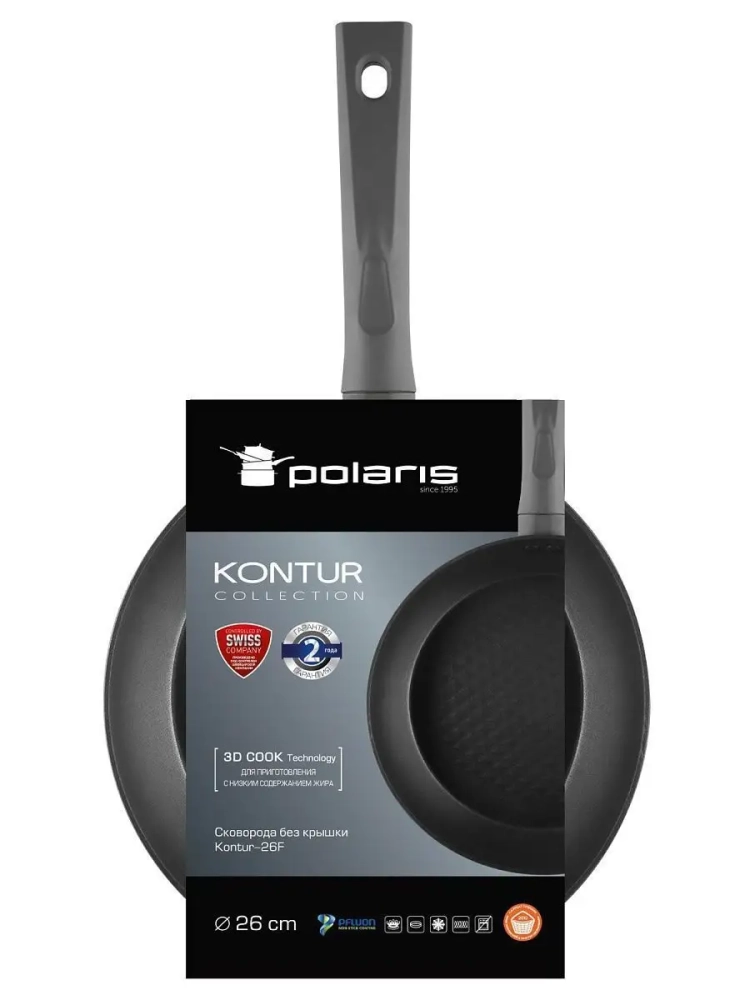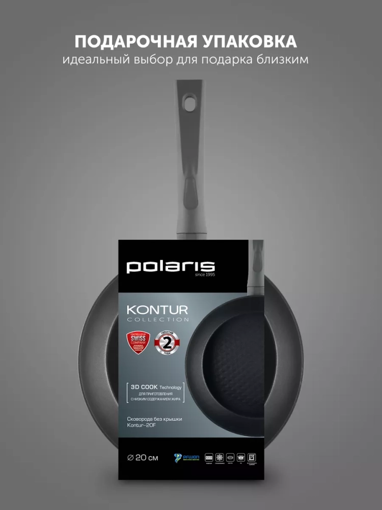 Бренд Polaris представляет коллекцию сковород без крышки Kontur 20F, разработанных совместно с европейскими инженерами и соответствующих европейским сертификатам качества. Мы стремимся предоставлять продукцию с лучшими эксплуатационными характеристиками по доступной цене, чтобы улучшить вашу жизнь и здоровье. Гарантия на нашу сковороду составляет 2 года. Изготовленная из высококачественного кованного алюминия, наша сковорода легче, чем чугунные или литые аналоги, и в то же время имеет лучшие эксплуатационные характеристики. Данная посуда равномерно прогревается и долго сохраняет тепло, а также подходит для любого типа плит, включая индукционные. Внутренняя поверхность сковороды обладает инновационной рельефной 3D COOK Technology, которая устойчива к царапинам и износу, а также равномерно распределяет масло. Благодаря этому продукты не пригорают, не прилипают и сохраняют свою натуральную свежесть и вкус. Отныне с помощью сковороды Polaris вы сможете воплотить в жизнь самые сложные кулинарные рецепты - от обжарки мяса и картошки до приготовления десертов. Наша сковорода безопасна для здоровья, снабжена эргономичной бакелитовой ручкой с покрытием SOFT TOUCH, что предотвращает скольжение и перегрев ручки. Благодаря удобному размеру диаметром 20 см, наша сковорода идеально подходит для готовки различных блюд как для большой, так и для маленькой семьи. Кроме того, поларис предлагает большой выбор аксессуаров для дома и туризма, среди которых сковорода диаметром 24 и 26 см. Также у нас вы найдете сковородки с крышкой и сковородки со съемной ручкой, идеально подходящие для использования на индукционных плитах. Не ограничивайте возможности своей кухни и дома - выберите оригинальный подарок от Polaris, который порадует как начинающего повара, так и профессионала. Покупайте наши товары со скидками и акциями в официальном магазине Polaris. С нашей продукцией вы получите гарантию качества и соответствия описанию.