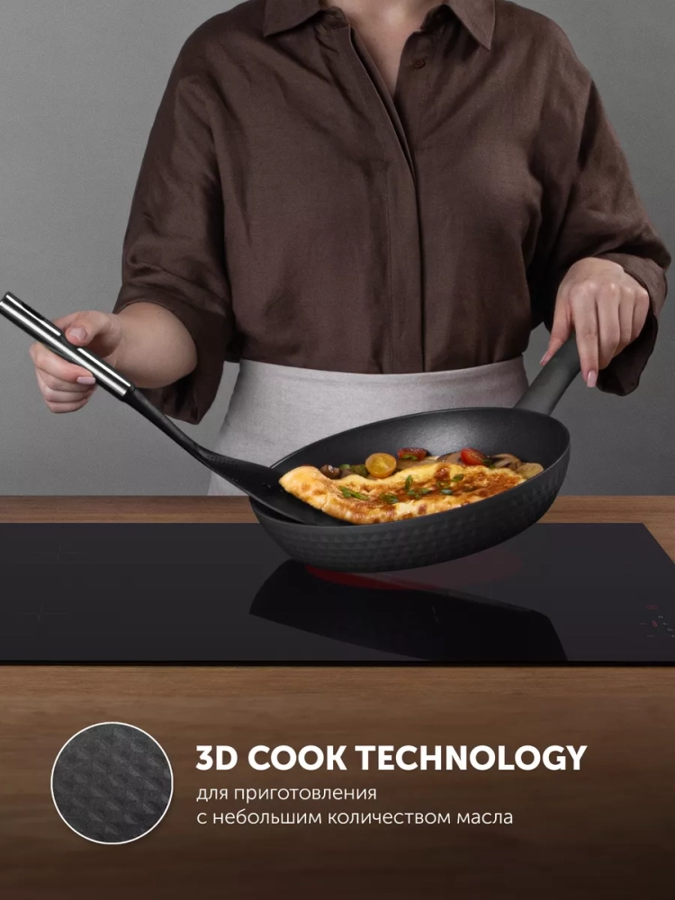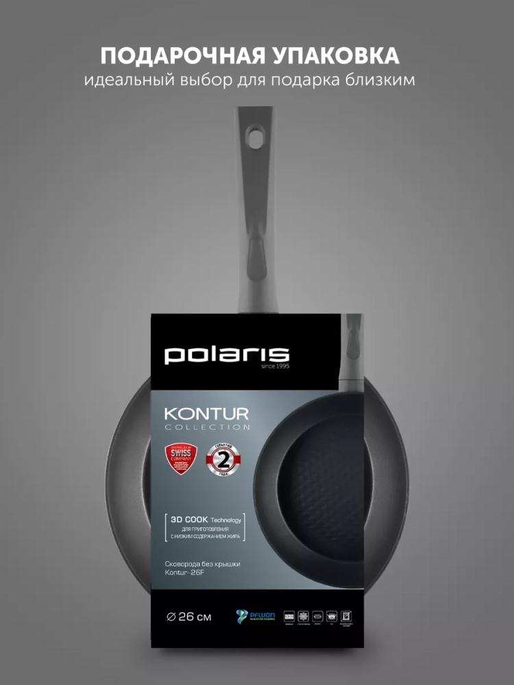 Изготовлена из высококачественного кованного алюминия. Сковородки из этого материала не такие тяжёлые, как чугунные и литые. Но их эксплуатационные характеристики даже лучше. Посуда равномернее прогревается и дольше сохраняет тепло, чем штампованная. ПОДХОДИТ ДЛЯ ВСЕХ ПЛИТ, ВКЛЮЧАЯ ИНДУКЦИОННЫЕ!. Инновационной рельефной 3D COOK Technology, которая устойчива к царапинам и износу, а также равномерно распределяет масло. Благодаря этому продукты не пригорают и сохраняют свою натуральную свежесть и вкус. С Polaris можно воплотить в жизнь все кулинарные рецепты, так как на ней можно потушить вкуснейшие овощи, обжарить нежное мясо, отварить сложный гарнир, сделать густой пряный соус и даже приготовить изысканный десерт. Сковородка полностью безопасна для здоровья и не содержит вредных веществ, а также не требует особенного ухода, легко моется как вручную, так и в посудомоечной машине. Эргономичная бакелитовая ручка с покрытием SOFT TOUCH не скользит и не нагревается.