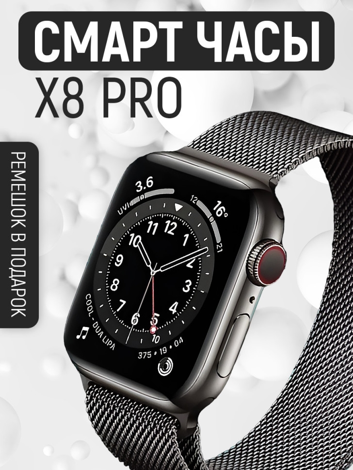 Смарт часы Smart Watch X8 PRO - это инновационный гаджет, который объединяет в себе функции умных часов и фитнес браслета. Они станут незаменимым аксессуаром для владельцев устройств на базе Android (андроид) и iOS (iphone). Взаимодействие с телефоном происходит через специальное приложение Wearfit Pro посредством bluetooth (блютуз) версии 5.0 и выше. Одной из ключевых особенностей смарт-часов является яркий безрамочный дисплей диагональю 45 мм, обеспечивающий насыщенные цвета и четкость изображения. Сенсорный экран имеет прочное акриловое стекло, что делает его надежным и долговечным. Смарт часы 8 серии предлагают множество функций для различных сфер жизни: от спорта и фитнеса до туризма и походов. С их помощью можно отслеживать количество пройденных шагов или расстояние, потребление калорий, измерять пульс и артериальное давление, проверять уровень кислорода в крови и даже анализировать качество сна. Они имеют оптимальный размер, стильно смотрятся на руке и подходят как для взрослых, так для детей и подростков. Мощная батарея высокой емкости позволяет активно использовать часы до 3-х дней. Для безопасной зарядки рекомендуется применение адаптера питания не более 2А, который покупается отдельно. Комплект поставки включает в себя беспроводную магнитную зарядку, два ремешка: металлический типа миланская петля - для придания делового стиля, и силиконовый - для повседневного использования. Все это аккуратно упаковано в компактную коробку с ярким дизайном. Ручные цифровые часы имеют степень защиты IP67, которая уберегает от пыли и водных брызг. Но их нельзя использовать для глубоких погружений и длительного замачивания в воде, а также подвергать воздействию горячей воды и пара. Smart часы - это отличный подарок как для парня или девушки, так для ребенка и школьника.