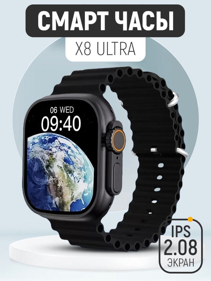 Умные наручные смарт-часы Smart Watch X8 ultra - электронный гаджет, который может использоваться как аксессуар или многофункциональный браслет. С ним Вы можете: принимать звонки и уведомления из СМС, мессенджеров и даже социальных сетей, от приложений, мониторить собственную активность, управлять музыкальным плеером и пользоваться голосовыми помощниками Siri и Алиса, просматривать погоду. Безрамочный сенсорный экран с высоким разрешением и ярким изображением, интуитивное управление с помощью боковой кнопки и колеса, мощный процессор для быстрой загрузки данных и реакции устройства, микрофон и динамик. В данной копии апл Вотч для айфона и андроида есть настройка меню. Функция блокировки паролем. Вы можете выбрать тренировку, засекать время на секундомере, переключить песню в спортзале, подсчитывать шаги, отслеживать пульс и фазы сна. Есть возможность установить собственное изображение. Смарт часы как телефон - становятся неотъемлемой частью жизни. Девайс совместим со смартфонами на iOS (Apple iPhone) и Android (Samsung, Xiaomi и другие). Подключение через Bluetooth 5.0. Серия 8 имеют время работы около 72 ч. (3 дня) в зависимости от активности использования. Пиковая производительность достигается после 7 полных циклов зарядки. Устройство (8 ультра) работает без сим карты.