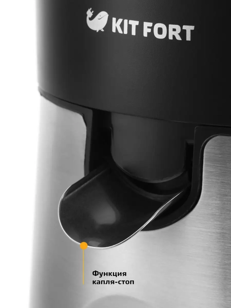 Соковыжималка Китфорт оснащена носиком, который вручную поднимается вверх, чтобы с него не стекали капли. В конструкции носика предусмотрен резиновый уплотнитель, который закрывает выход сока. Это очень удобно если переполнилась посуда и ее нужно заменить во время отжима. Противоскользящие ножки не дают прибору скользить по столу во время отжима сока, и гасят вибрации мотора.
