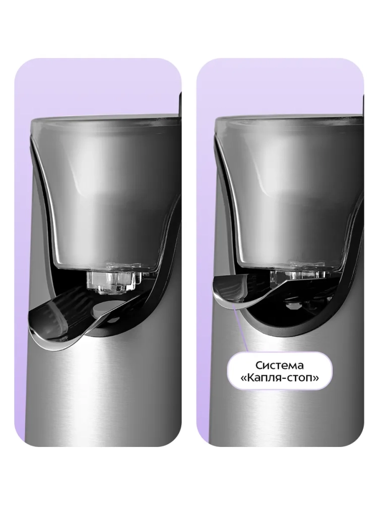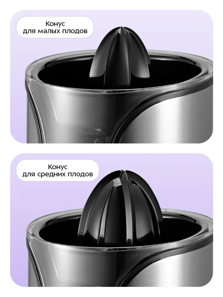 Соковыжималка Kitfort КТ-1119 предназначена для отжима сока из плодов цитрусовых: лимонов, грейпфрутов, апельсинов и др. Главное преимущество соковыжималок для цитрусовых - для нее не требуется очищать цитрусы от корки, их лишь необходимо предварительно разрезать пополам поперек долек. В комплекте к соковыжималке идет конус для маленьких плодов и конус для более крупных плодов, который надевается на маленький конус. Корпус устройства и носик выполнены из нержавеющей стали, на корпусе есть элементы пластика, остальные детали изготовлены из качественного пищевого пластика. Чтобы привести соковыжималку в действие нужно надавить плодом на конус для отжима сока, и конус начнет вращаться. Подача сока осуществляется сразу в стакан или в любую другую емкость, подходящую по высоте. Соковыжималка оснащена носиком, который можно поднять вверх, чтобы с него не стекали капли. В конструкции носика предусмотрен резиновый уплотнитель, который закрывает выход сока. Это очень удобно, если переполнился стакан и его нужно заменить во время отжима. Соковыжималку удобно мыть: все съемные части легко вынимаются. Соковыжималка собирается и разбирается меньше чем за 1 минуту. Прорезиненные ножки не дают прибору скользить по столу во время отжима сока и гасят вибрации мотора. Снизу соковыжималки имеется отсек для хранения шнура, в который можно смотать излишки шнура электропитания, чтобы он не мешал на столе.