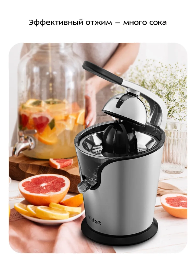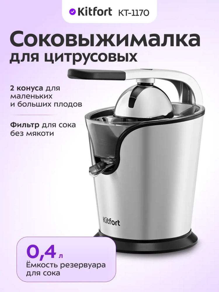 Соковыжималка для цитрусовых Kitfort КТ-1170 предназначена для отжима сока из плодов цитрусовых: лимонов, грейпфрутов, апельсинов и др. Главное преимущество соковыжималки для цитрусовых — для нее не требуется очищать цитрусы от кожуры: их лишь необходимо предварительно разрезать пополам поперек долек.