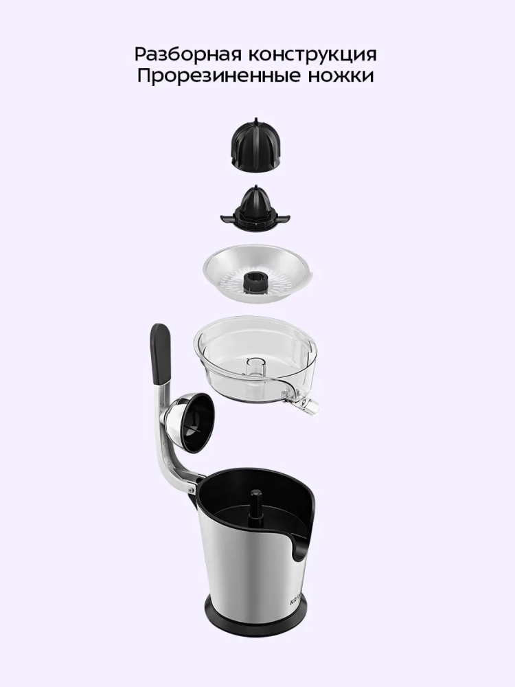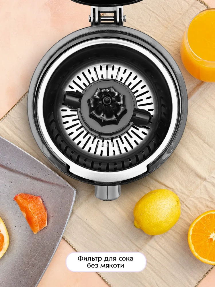 Крышка, конусы, фильтр, чаша, а также шпиндель легко снимаются и моются. Прорезиненные ножки с присосками не дают прибору скользить по столу во время отжима сока.