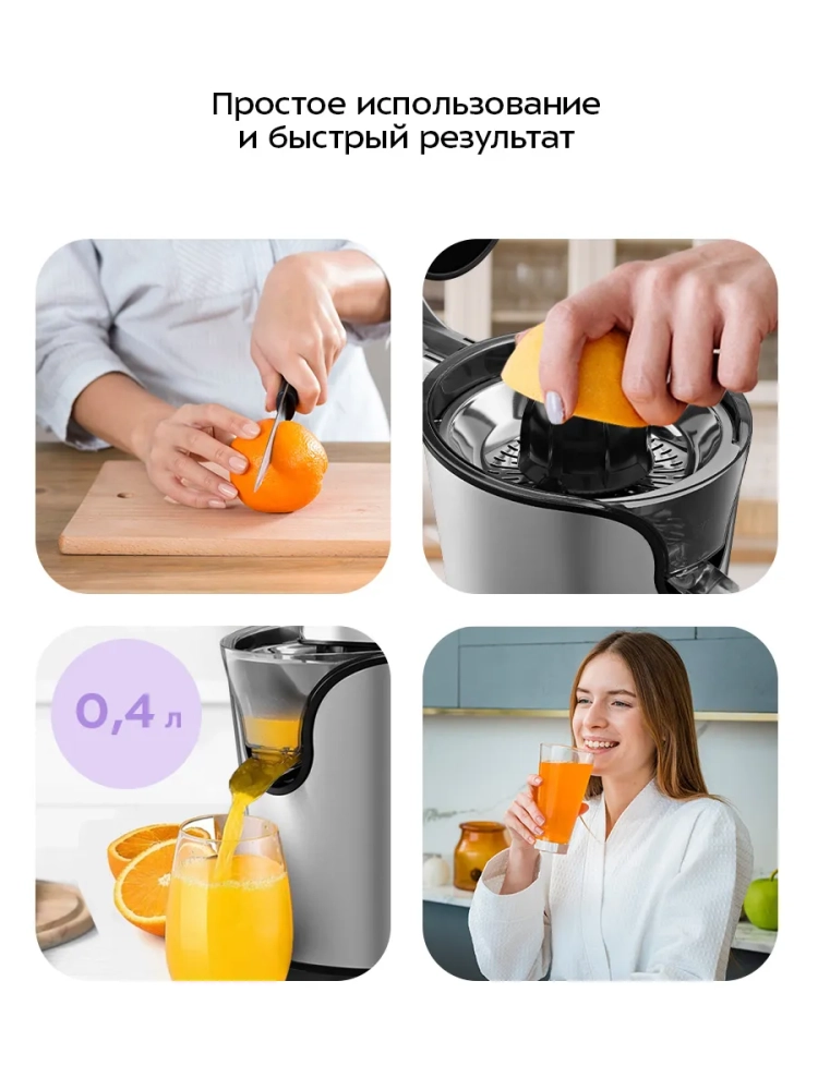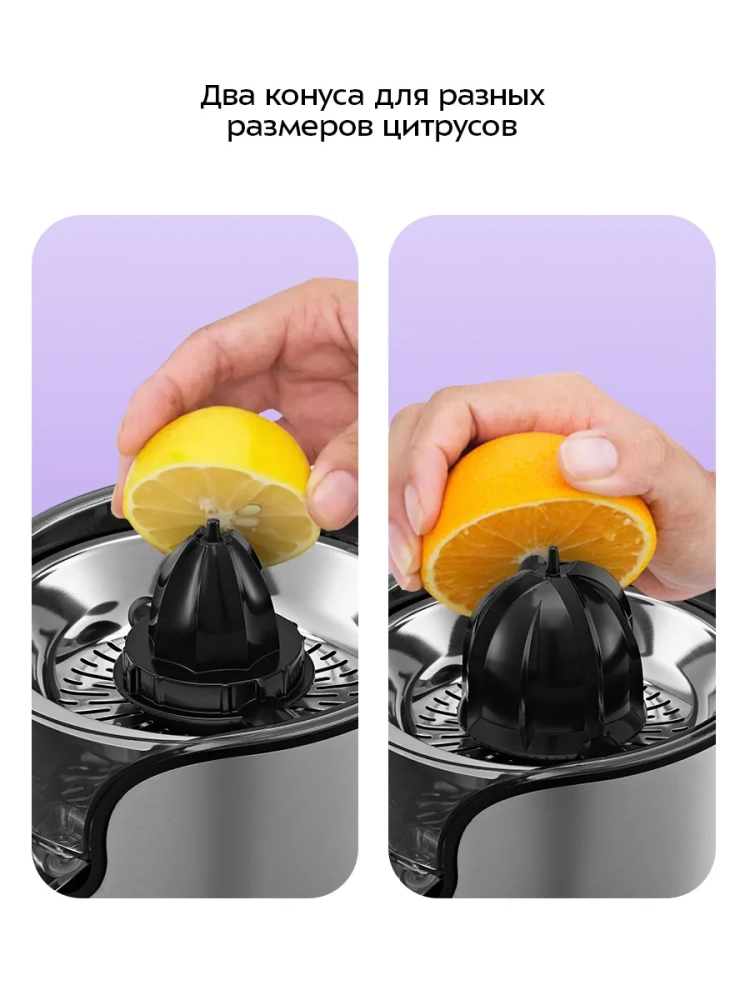 Чтобы привести соковыжималку в действие, нужно надавить плодом на конус для отжима сока, и конус начнет вращаться. Благодаря наличию фильтра крупные куски и косточки не попадают в сок. В комплекте к соковыжималке идет два конуса: малый конус для небольших плодов, таких как лимоны или лаймы, и большой конус для апельсинов, грейпфрутов и других крупных цитрусовых.