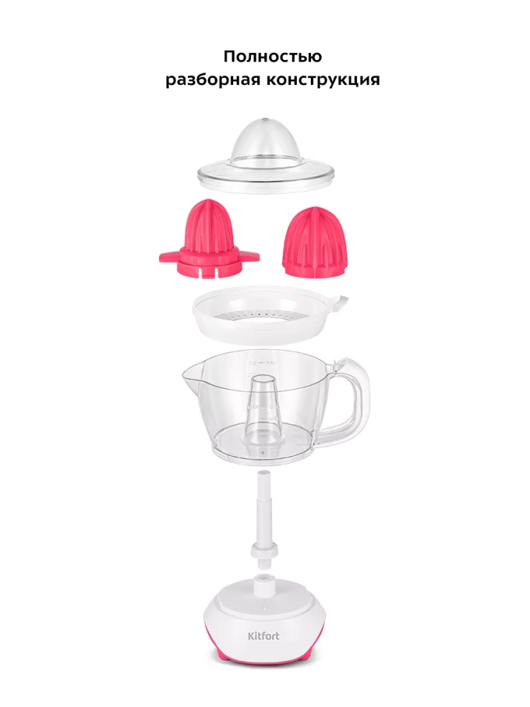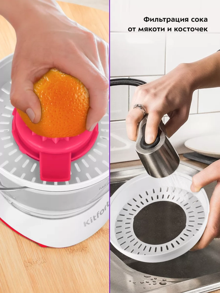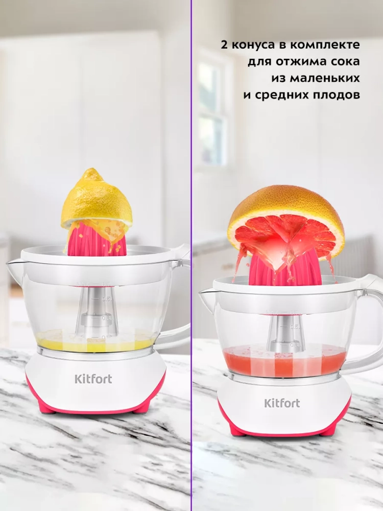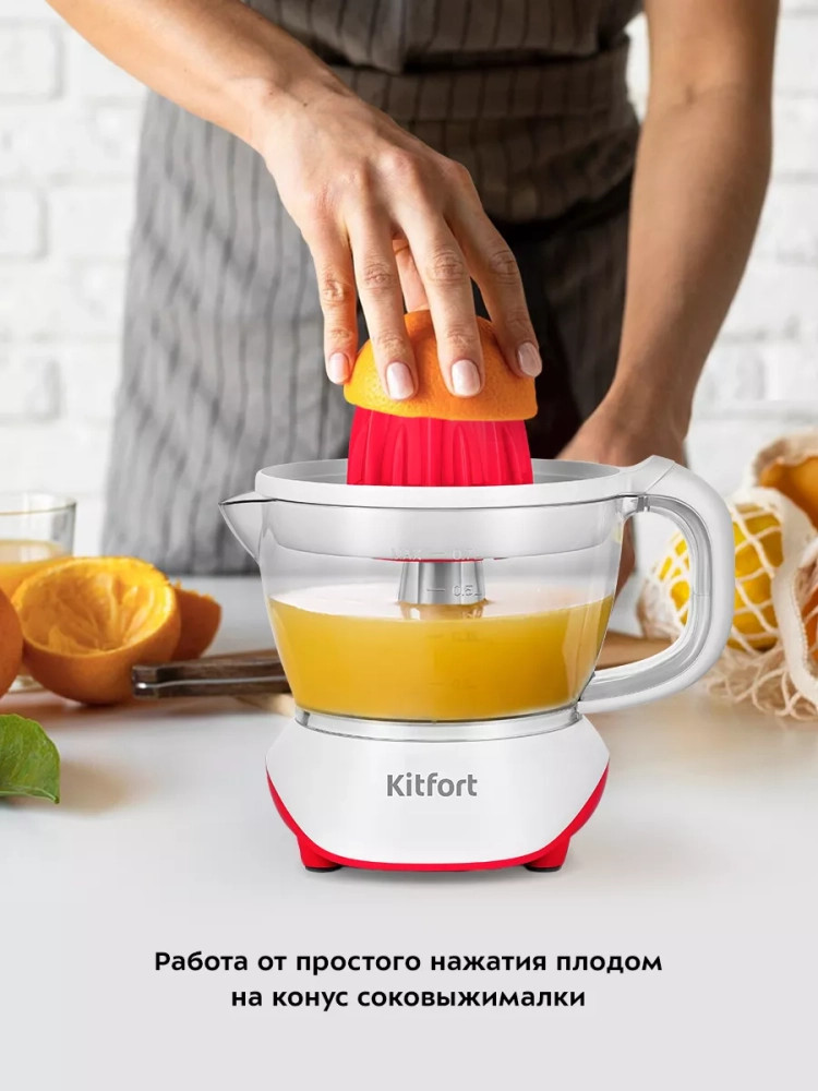 Соковыжималка Kitfort КТ-1147 предназначена для отжима сока из плодов цитрусовых: лимонов, грейпфрутов, апельсинов и др. Главное преимущество соковыжималки для цитрусовых — для нее не требуется очищать цитрусы от корки, их необходимо лишь предварительно разрезать пополам поперек долек.
