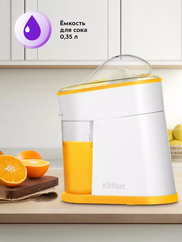 Соковыжималка Kitfort КТ-1150 предназначена для отжима сока из плодов цитрусовых: лимонов, грейпфрутов, апельсинов и др. Главное преимущество соковыжималки для цитрусовых — для нее не требуется очищать цитрусы от корки, их лишь необходимо предварительно разрезать пополам поперек долек.