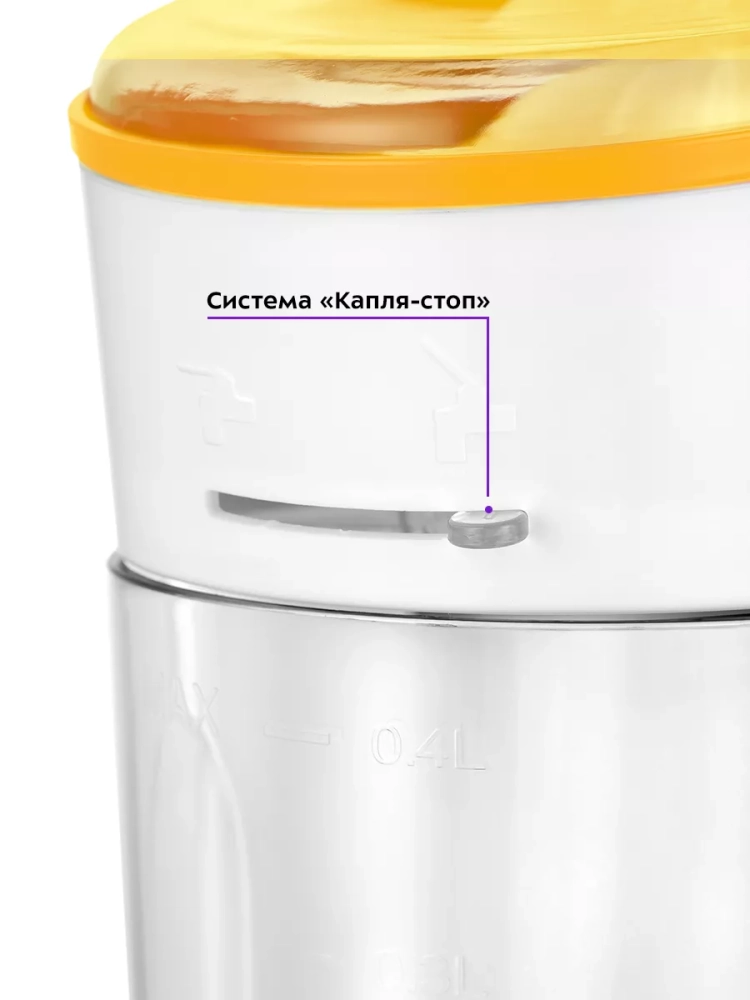 В соковыжималке КТ-1150 предусмотрена противокапельная система. Под отверстием для выхода сока есть фиксатор с заглушкой, который обеспечивает его герметичное закрытие, если контейнер для сока не установлен.