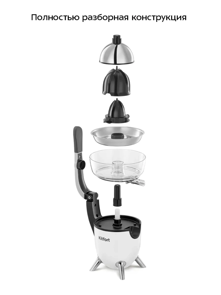 Крышка, конусы, фильтр, чаша, а также шпиндель легко снимаются и моются. Прорезиненные ножки не дают прибору скользить по столу во время отжима сока.
