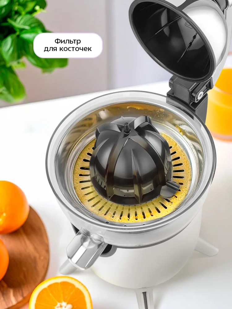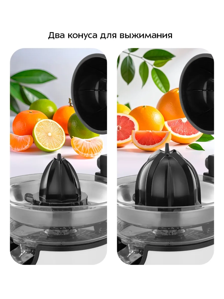 Чтобы привести соковыжималку в действие, нужно надавить плодом на конус для отжима сока, и конус начнет вращаться. Благодаря наличию фильтра крупные куски и косточки не попадают в сок. В комплекте к соковыжималке идет два конуса: малый конус для небольших плодов, таких как лимоны или лаймы, и большой конус для апельсинов, грейпфрутов и других крупных цитрусовых.