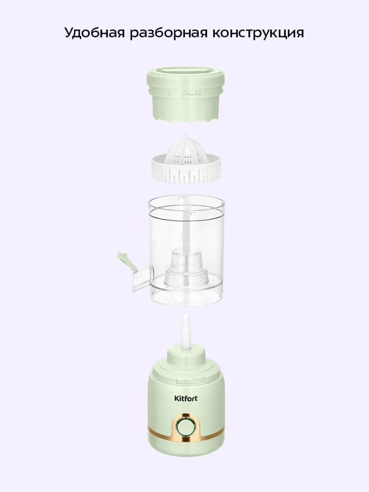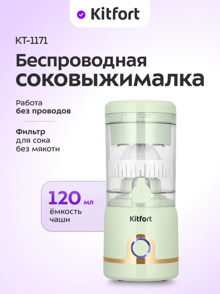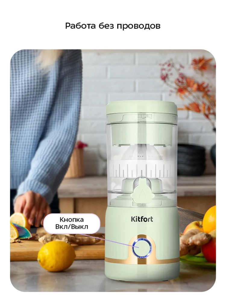 Беспроводная соковыжималка для цитрусовых Kitfort КТ-1171 предназначена для отжима сока из плодов цитрусовых: лимонов, грейпфрутов, апельсинов и др. Главное преимущество соковыжималки для цитрусовых — для нее не требуется очищать цитрусы от кожуры: их лишь необходимо предварительно разрезать пополам поперек долек.