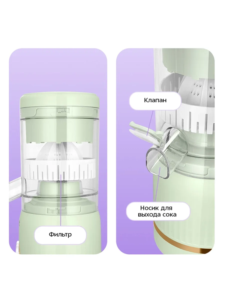 Крышка, конус и чаша легко снимаются и моются. Соковыжималка имеет компактный размер и работает от аккумулятора, благодаря чему ее можно взять с собой, например, в поездку. Прорезиненные ножки не дают прибору скользить по столу во время отжима сока.