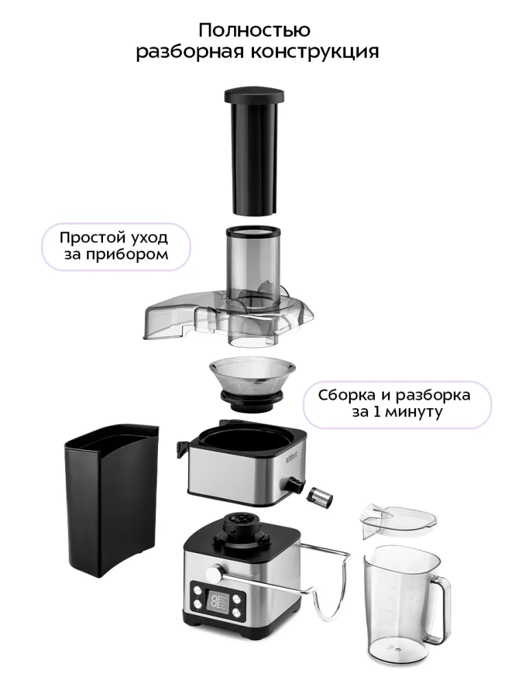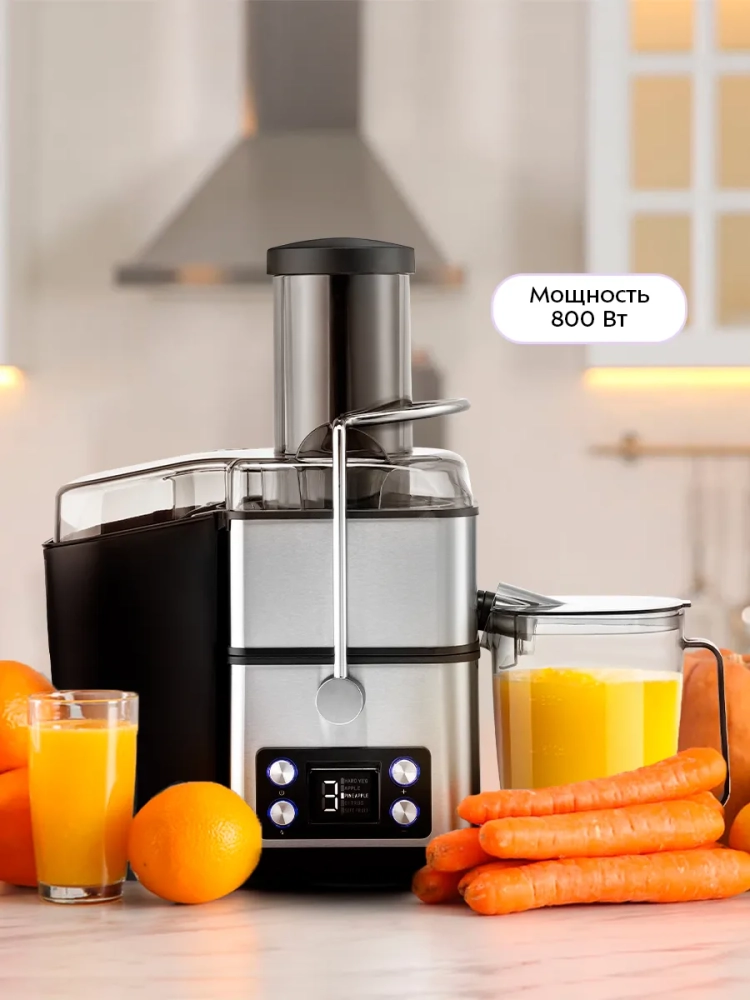Электрическая соковыжималка Kitfort KT-1134 — это современный прибор для тех, кто ценит свежие и полезные напитки. С мощностью 800 Вт, эта соковыжималка позволяет быстро и эффективно извлекать литр сока из фруктов, овощей и зелени. Благодаря центробежной технологии отжима, продукты сначала измельчаются специальной теркой, а затем попадают в фильтр-центрифугу. На высоких оборотах происходит отделение сока от жмыха, который автоматически сбрасывается в специальный бак. Соковыжималка Kitfort KT-1134 оснащена большой загрузочной горловиной, что позволяет загружать крупные фрукты и овощи целиком без предварительной нарезки. Это делает процесс приготовления сока быстрым и удобным. Мощный двигатель обеспечивает быструю переработку продуктов без потери качества сока. Этот кухонный прибор идеально подходит для приготовления свежего томатного или яблочного сока каждое утро. Вы можете наслаждаться натуральными напитками из яблок, помидоров (томат) или других любимых плодов благодаря универсальности этой модели. Соко выжималка электрическая КТ-1134 станет незаменимым помощником на вашей кухне благодаря своей надежности и долговечности работы. Она справляется как с мягкими плодами типа помидоров (томат), так и с твердыми корнеплодами. Kitfort KT-1134 — это профессиональный электро бытовой прибор для ежедневного использования дома или на работе. Техника сочетает в себе функциональность и простоту ухода: легко собирается после использования и не требует сложного обслуживания.