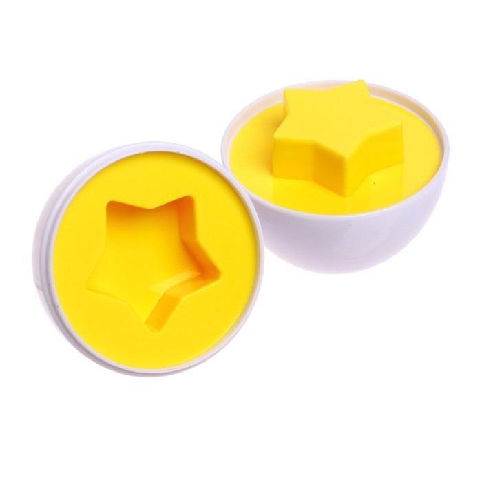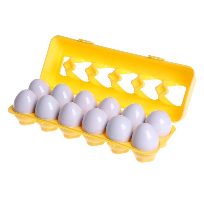 - Детали сортера — яйца, каждое делится на две части. Перемешайте детали, а ребёнок будет искать подходящие половинки.